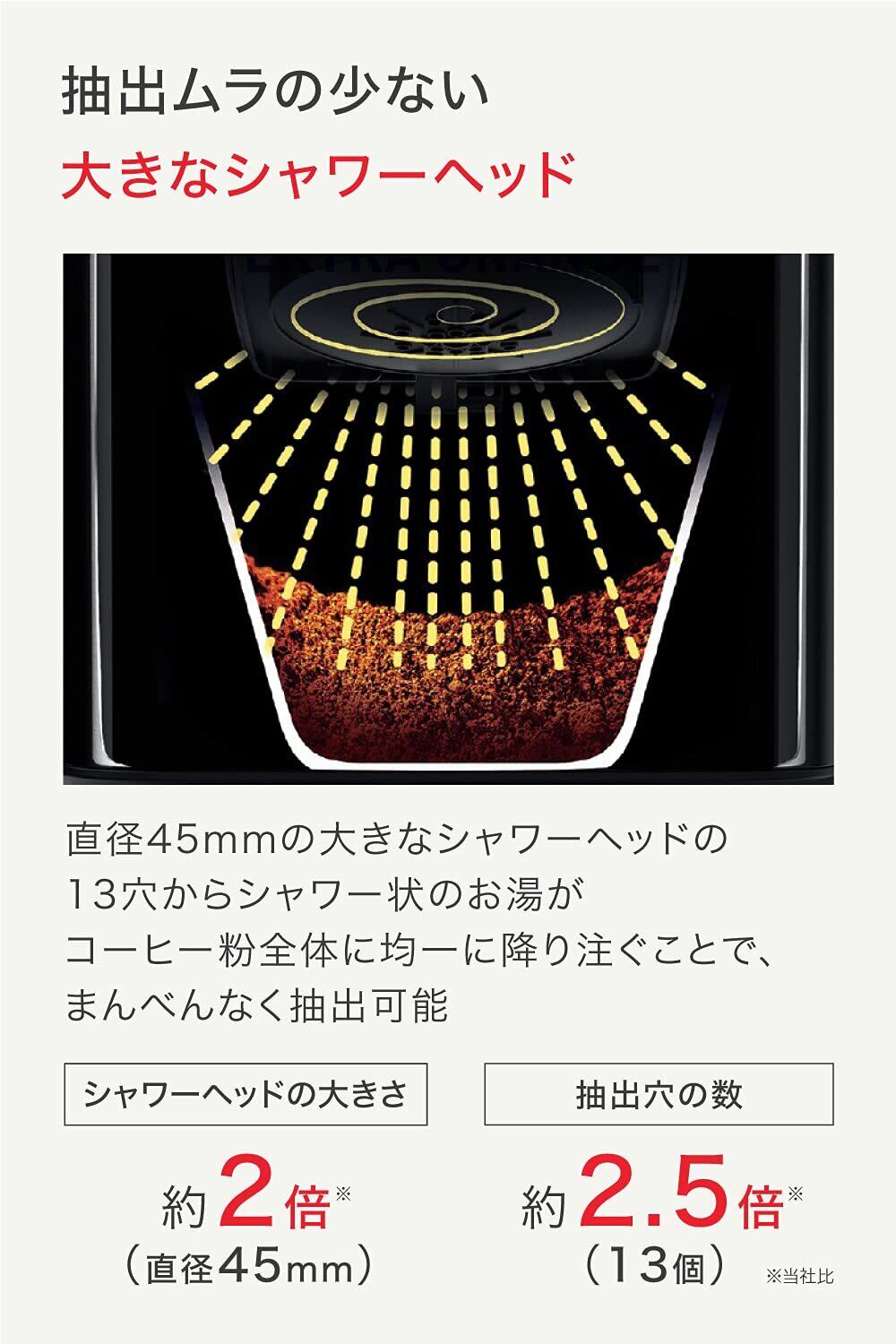 ●直径45mmの大きなシャワーヘッドの13穴からお湯がシャワー状に降り注くことで、コーヒーをまんべんなく抽出可能