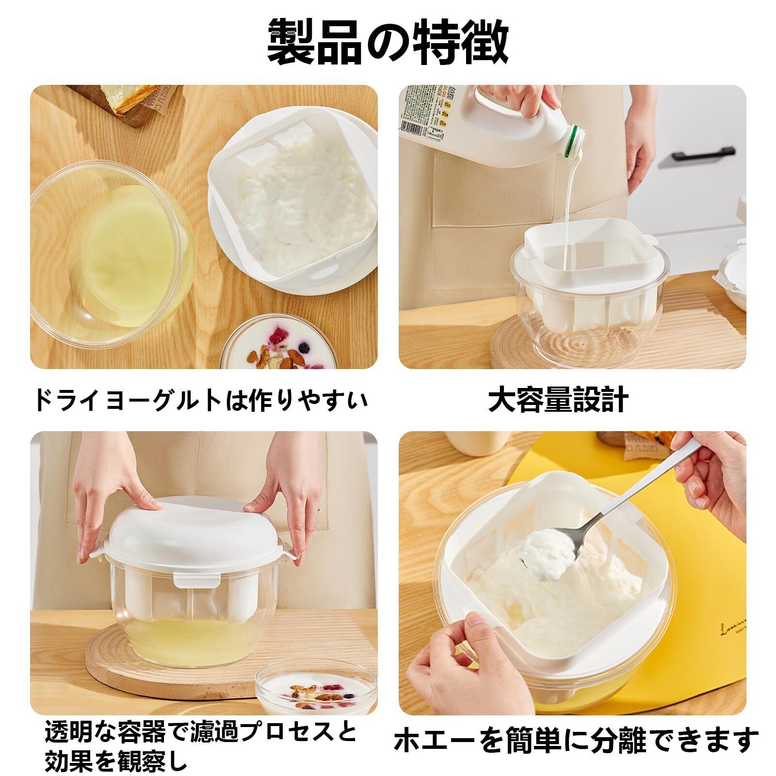【水切りヨーグルトメーカー】水切りヨーグルトメーカーはヨーグルトの厚みを増し、ホエーを簡単に分離できます。無添加で自家製ヨーグルトのまろやかな味わいをお楽しみいただけます。 このヨーグルトストレーナーを使えば、お好みのヨーグルト、チーズ、豆乳などが簡単に作れます。 液体をストレーナーに注ぎ、自然に排出するだけです。
