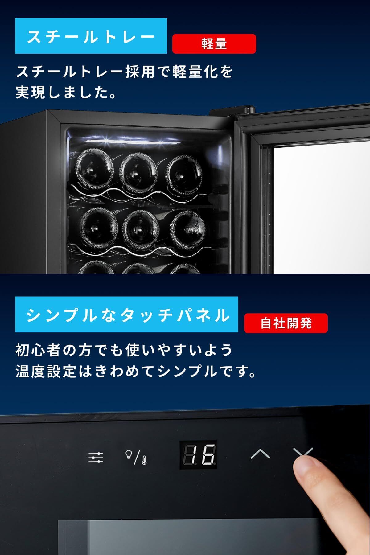 【初心者でも安心して使える、簡単操作のワインセラー】 ✓ 簡単操作 難しい設定は一切不要。タッチパネルで温度調整が可能です。