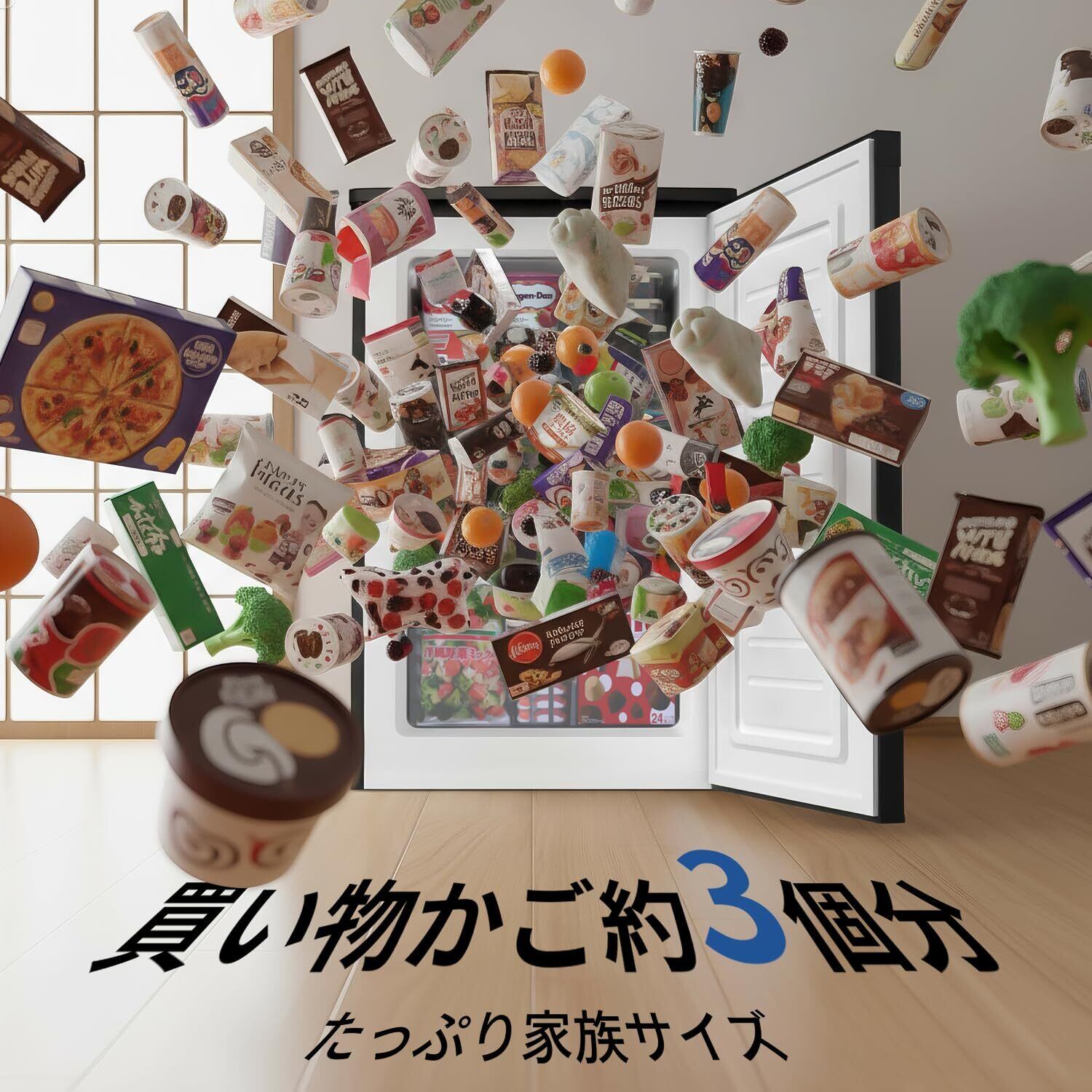 【一年中活躍する省エネ冷凍庫】 型番:ZU100;定格内容積:100L;定格電圧:100V~;定格周波数:50/60Hz共用;定格消費電力:100W;消費電力量:50Hz:193kWh/年、60Hz:193kWh/年。この冷凍庫は、夏場の冷たい飲み物やアイスクリームの保存から、冬場の肉類や乾物の長期保存まで幅広く対応します。一年を通じてあらゆる食品保存のニーズを満たす省エネ設計で、家庭に欠かせない便利なパートナーです。