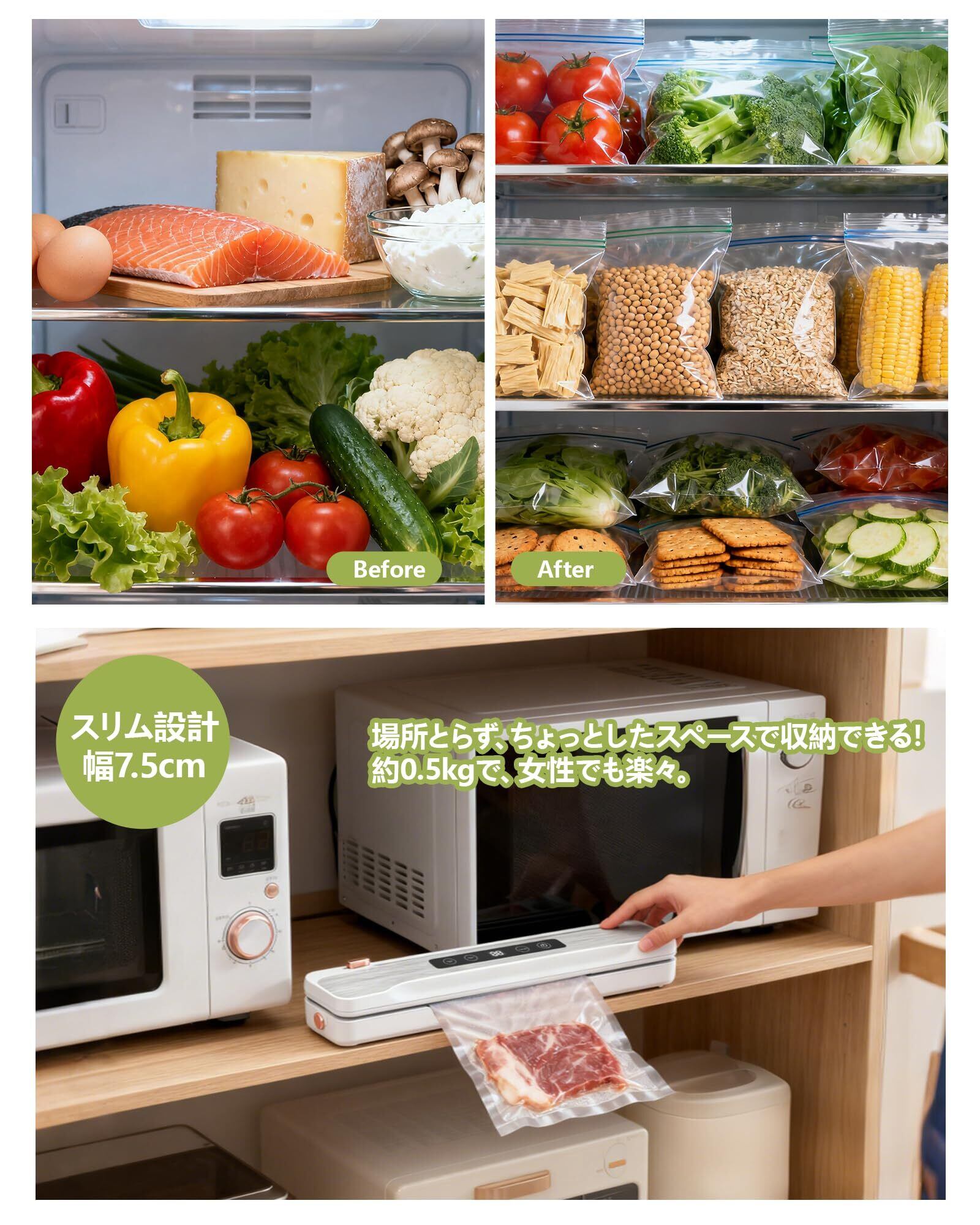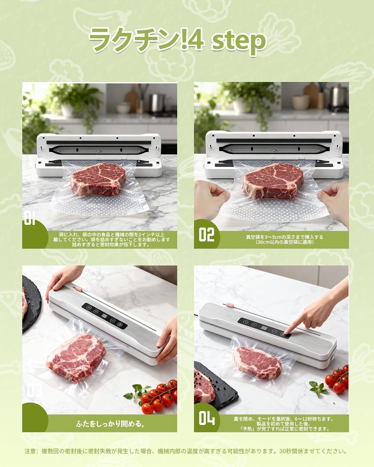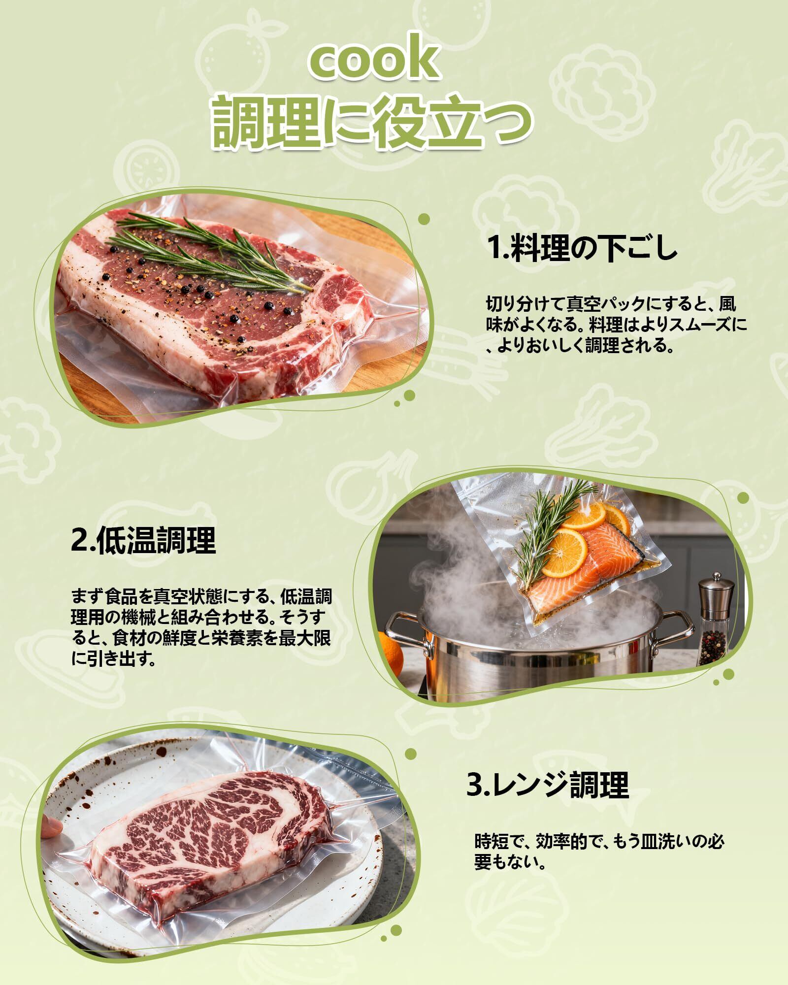 多様な料理シーンに対応 切りおき保存:調理下ごしらえの食材を新鮮に保ち、調理をスムーズに 下味付け:味がしっかり染み込むよう支援 真空 / レンジ調理:加熱ムラを防いでジューシーに仕上げ、洗い物を減らして時短 肉・魚・野菜・果物など幅広い食材に対応し、フードシーラー 真空パック機 特定食材は長期保存も可能です。