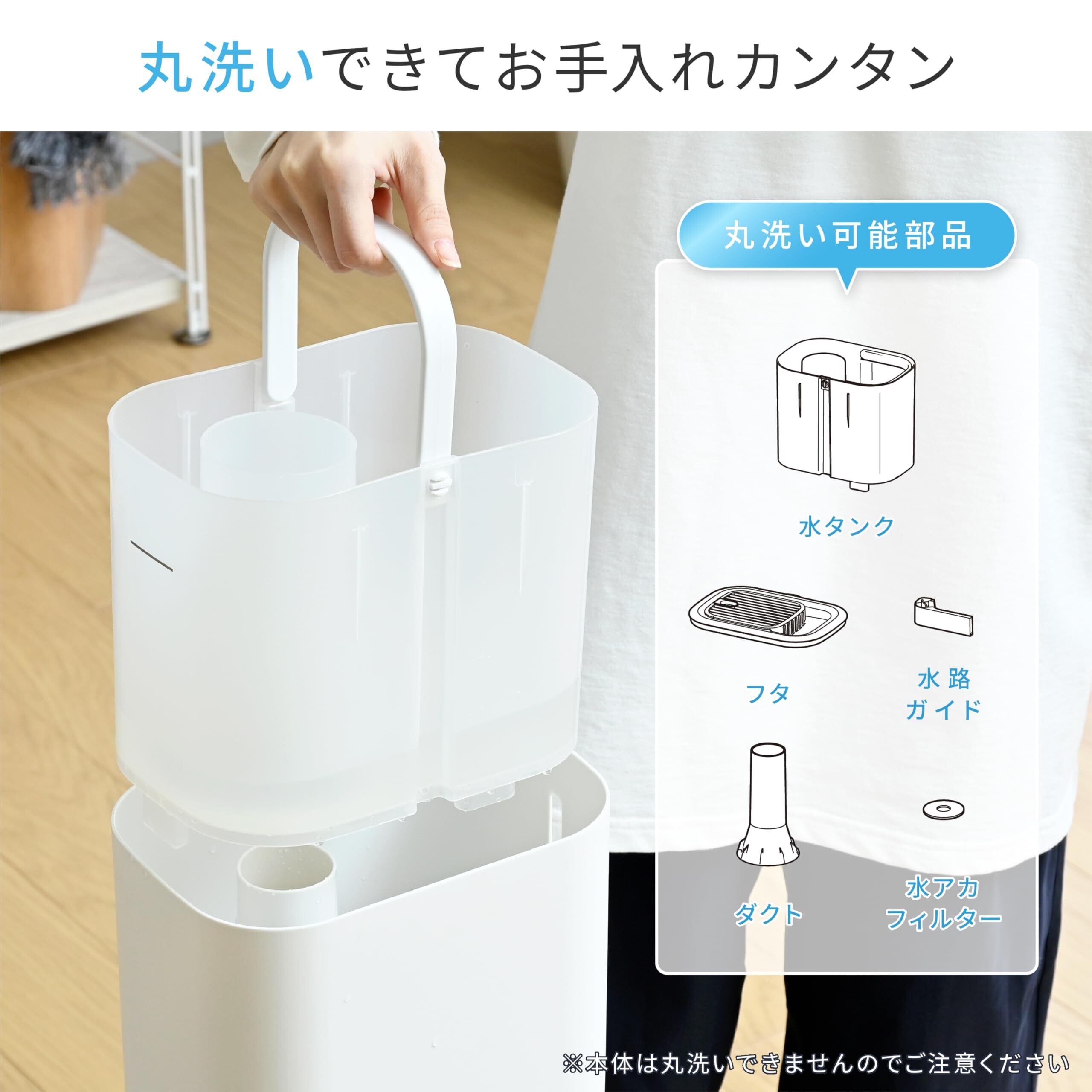 【簡単給水】本体上部からそのまま水を注げる簡単給水タイプ。使用場所などに合わせて2パターンの給水方法(①本体を置いたまま上から水を注ぐ②タンクを取り外して蛇口から水を注ぐ)が選べます。タンクは取り外して丸洗い可能なので、お手入れも簡単です。
