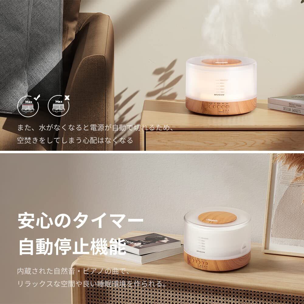 MUSON(ムソン) 加湿器 卓上 超音波式 アロマディフューザー 500ML アロマ対応 花粉対策 静音 タイマー 大容量 上から給水 ナイトライト 間接照明 明るさ調整可 音楽内蔵 空焚き防止 お手入れ簡単 乾燥対策 おしゃれ 木目調 ホワイト 部屋/寝室/会社用