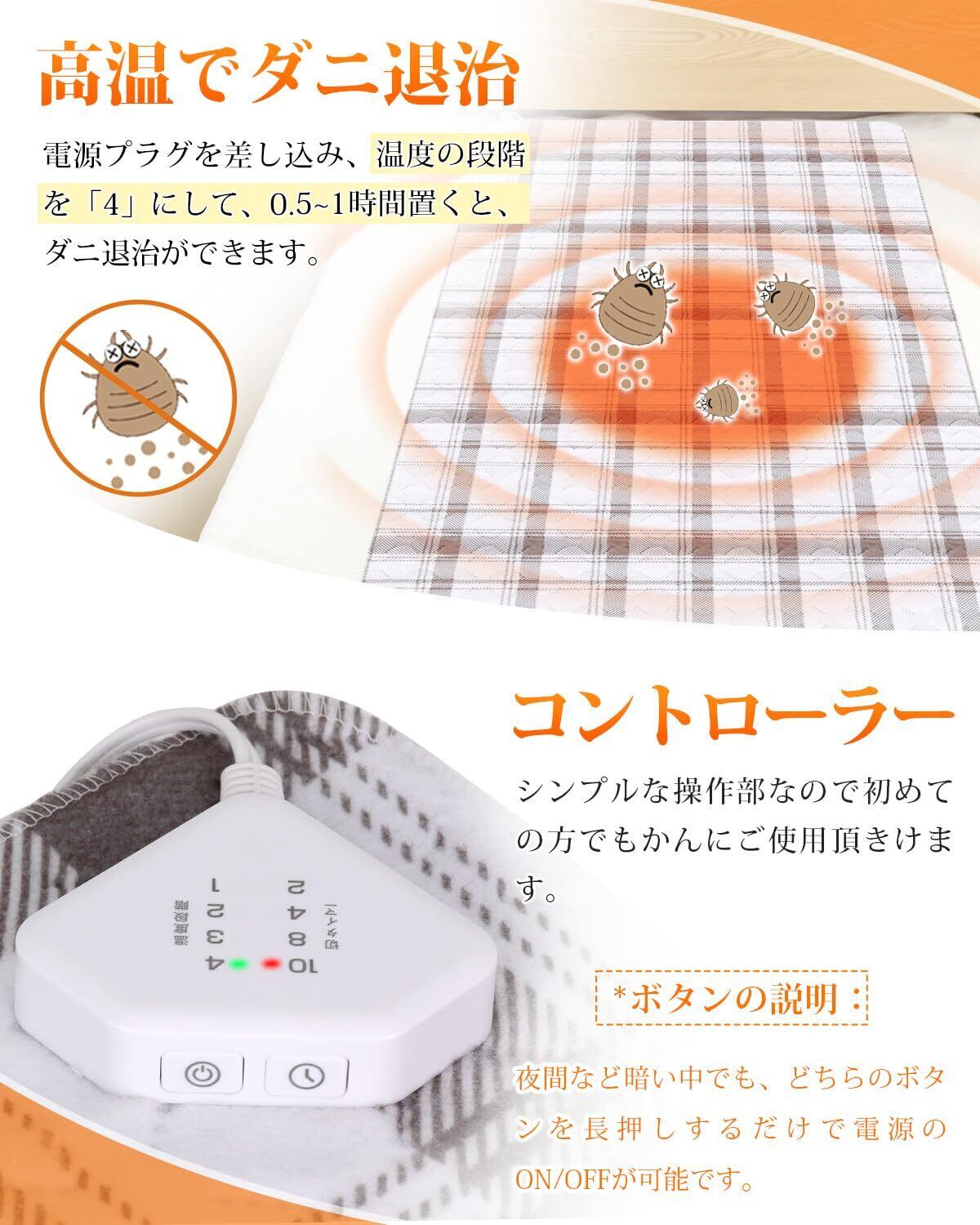 【ダニ退治機能・抗菌除臭】お肌の近くで使う寝具だから、肌にやさしくて清潔を保ち、健康のために高温でダニ退治機能もあり、電気毛布をポリ袋に入れて、布団に挟み、3時間「強」で運転するだけです。布団内部が素早く温まる、足元を中心にしっかりあたためますので快適にすごせます。足先が冷えてなかなか寝つけない人にもおすすめです。PSEマーク認証取得正規品!過電圧保護、漏電保護、過熱断電保護など、安全装置がしっかり備わっているので、万が一の時も安心です。