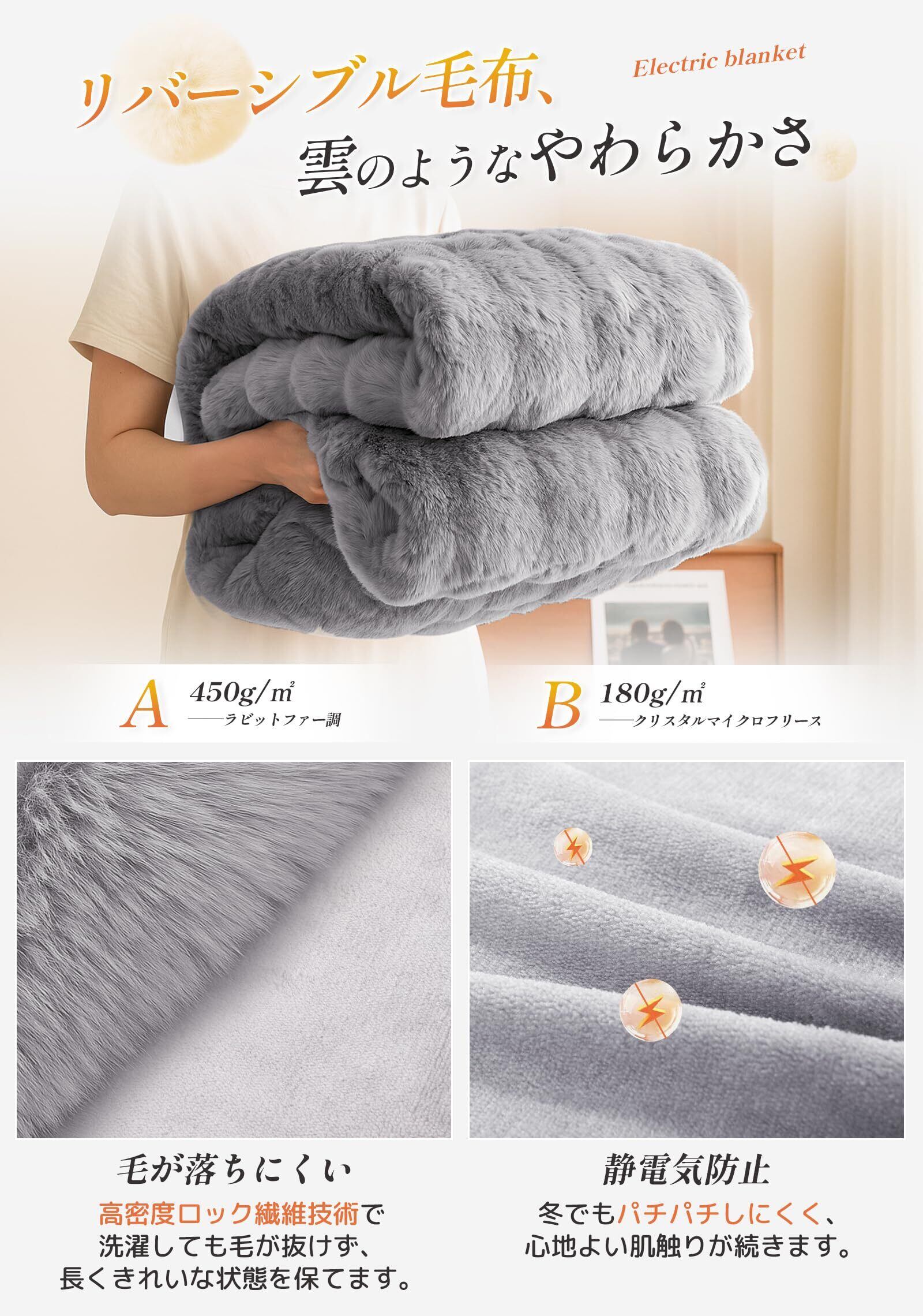 【両面異素材の極上肌触り・一晩中続く温もり】森羅電気しき毛布は、表地に高密度の高級ラビットファー調素材を贅沢に採用。長毛が空気を閉じ込めて「毛布自体が発熱するような」究極の暖かさを実現します。その肌ざわりはモニターから「とろけるようなやわらかさ」「ずっと触っていたくなる滑らかさ」と絶賛され、ふわりと軽やかな包み込みが、朝まで続く極上の安眠体験をお届けします。