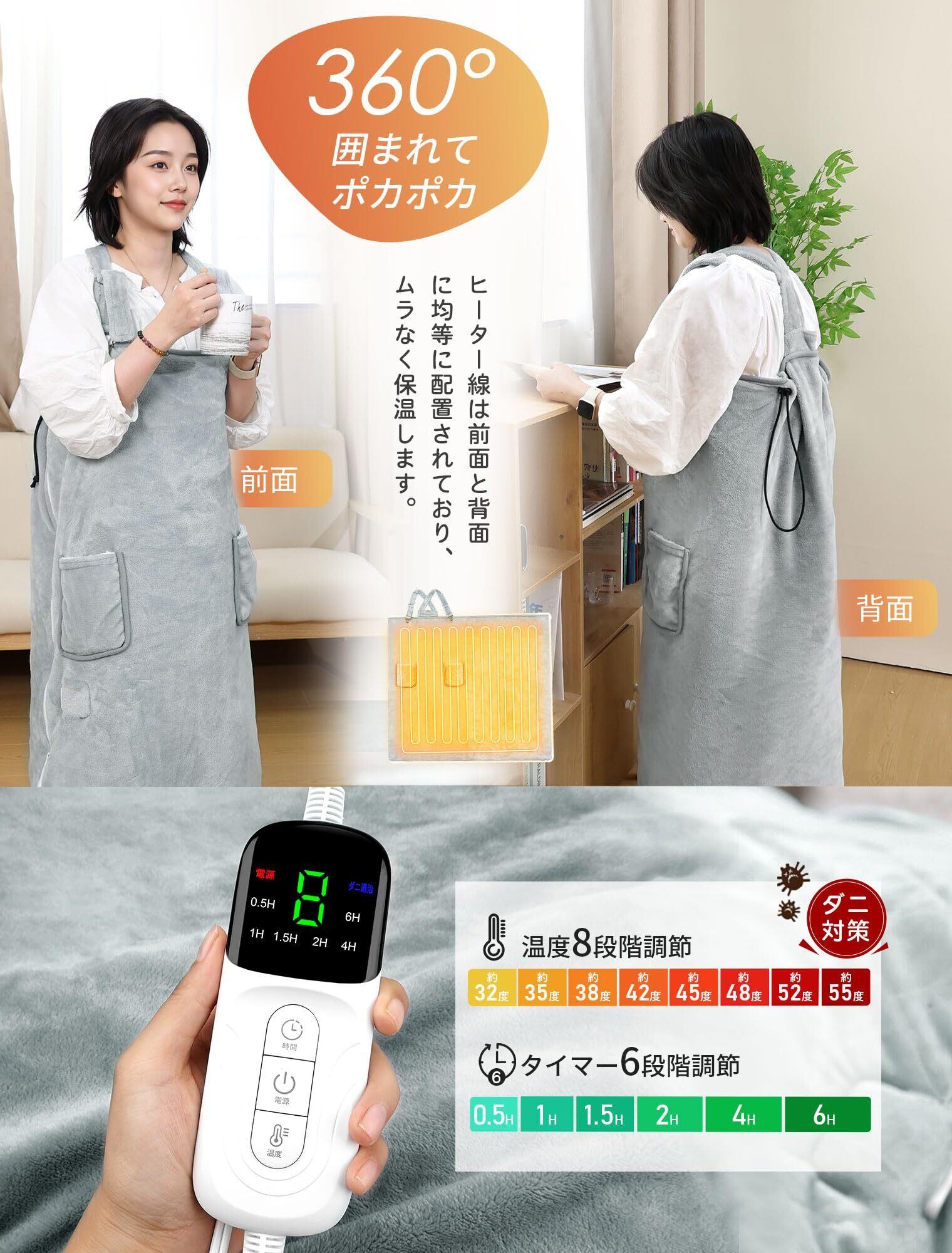[MunzeYi] 電気毛布 着る 着るこたつ 360°立体発熱 掛け敷き兼用 メンズ レディース 8段階温度調節 6段階切タイマー 丸洗い可能 ダニ退治機能 省エネ 過熱保護 掛け敷き兼用 電気ブランケット 防寒対策 2M電源ケーブル グレー PSE認証済