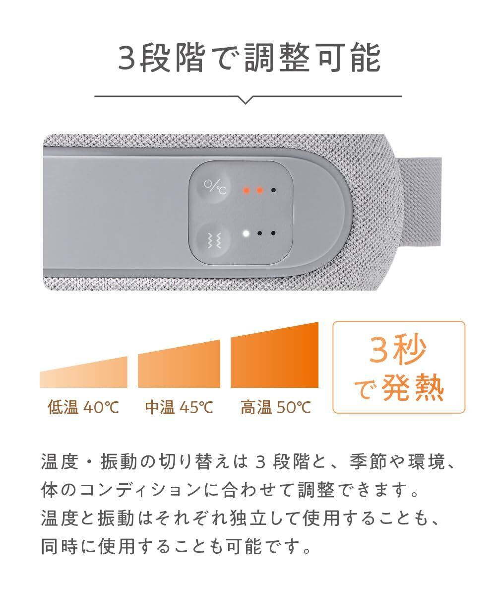 【機能】3秒で立ち上がり。低温40度、中温45度、高温50度の3段階で調整可能。温熱と振動はそれぞれ独立して使いこともできます。30分オートオフ機能付き。