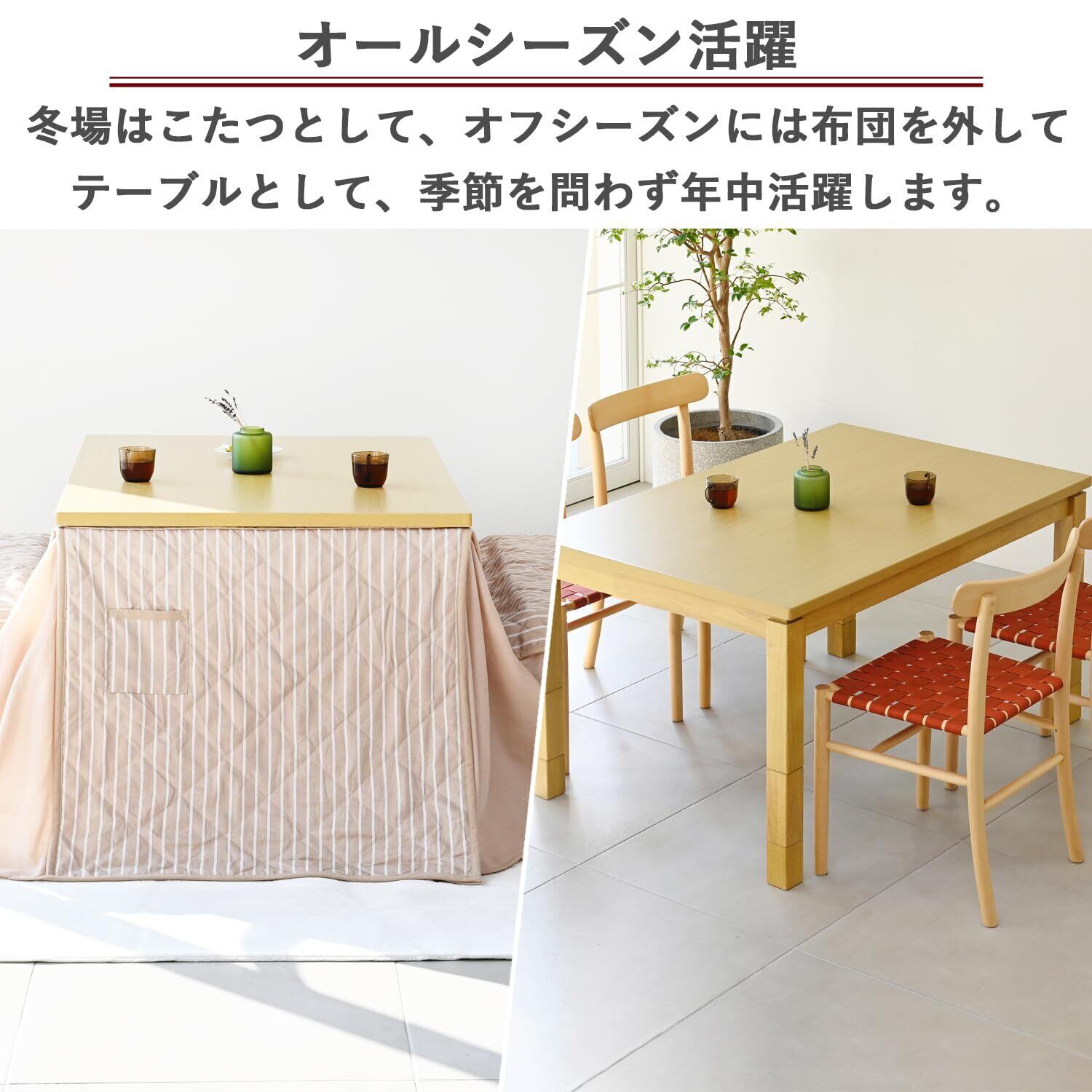 【オールシーズン活躍】ご家族でのご使用にオススメな長方形のこたつテーブル、届いてすぐに使える専用布団セット。寒い冬には足もとをぬくぬく暖めてくれ、夏場にはテーブルとして活躍します。シンプルなデザインなので、どんなお部屋にも馴染みます。