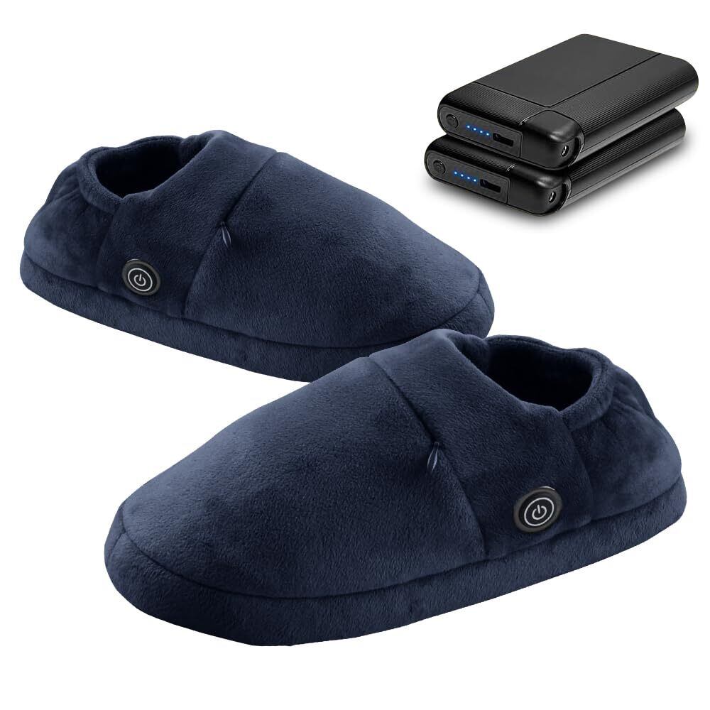 【コードなし 3秒で温度感知】電気スリッパ フットウォーマー 2個8000mAhバッテリー付き NTC過熱保護 30秒で速熱 自由に歩ける 3段階温度調節 電気足温器 防寒対策 室内履き 洗濯可能 男女兼用 日本語説明書付き (ブルー-円形ボタン, M)