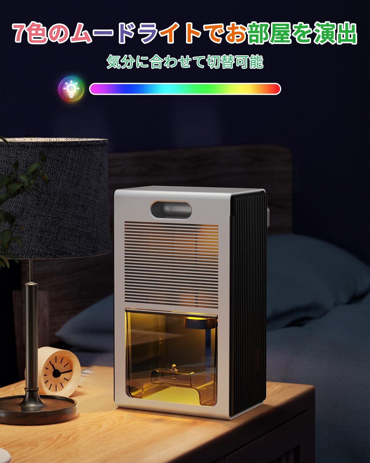 【7色ムードライト・静音スリープモード】 操作パネルのライトボタンを押すことで、7色のムードライトを切り替えることができます。ライトを消灯することも可能です。スリープモードを選択すると、ムードライトがオフになり、運転音もさらに低減。就寝中でも音が気にならず、快適な睡眠環境を保ちます。振動や動作音を抑えた静音設計のため、ご家庭だけでなくオフィスでも安心して使用できます。
