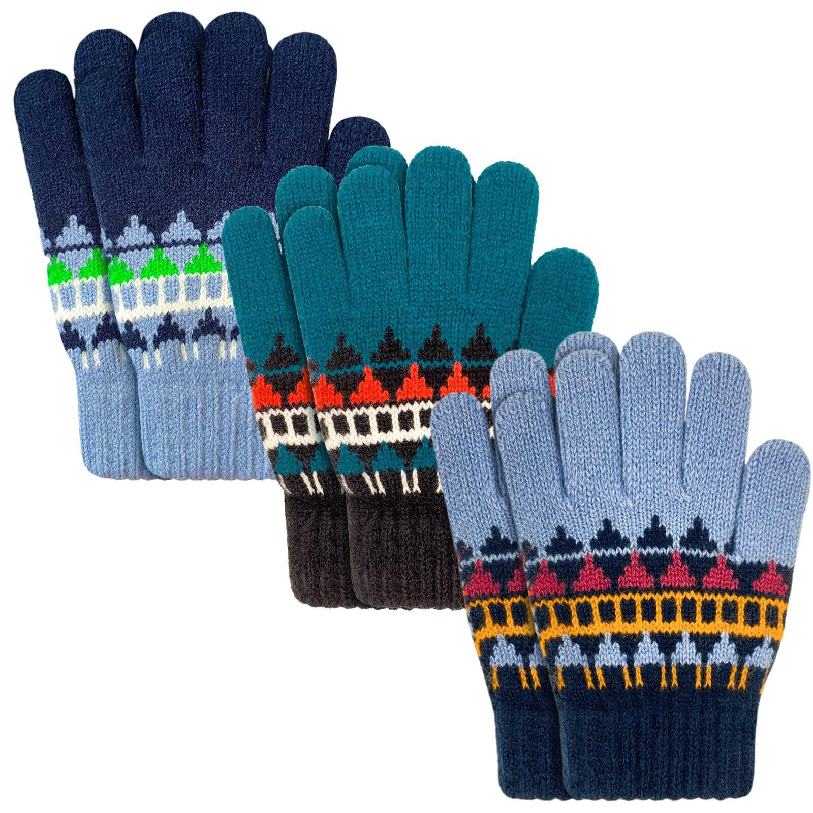 [夢の物] 3色組 ニット手袋 子供 キッズのびのび手袋 裏起毛 厚手 通園 通学 雪遊び アウトドア 秋冬 防寒 防風 あったかい 五本指 男の子