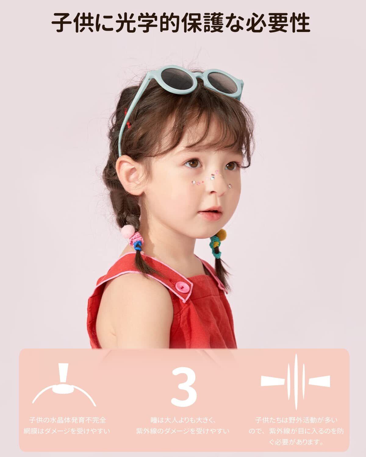 【紫外線からガード】 UV400レンズを使用しているため、紫外線からしっかりガード。日常の有害光線をカットし目を快適に保つ、。子供や幼児の大切な目を守ります。