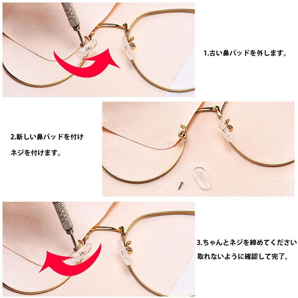 【交換簡単】1.古い鼻パッドを外します。2.新しい鼻パッドを付け、ネジを付けます。3.ドライバーで慎重にネジを回します。取れないように確認して完了。※ネジを取付の時は付属のピンセットをご利用ください。※ドライバーをご利用の際は付属のクロスをおいて、レンズに傷がつかないようにするのがオススメです。