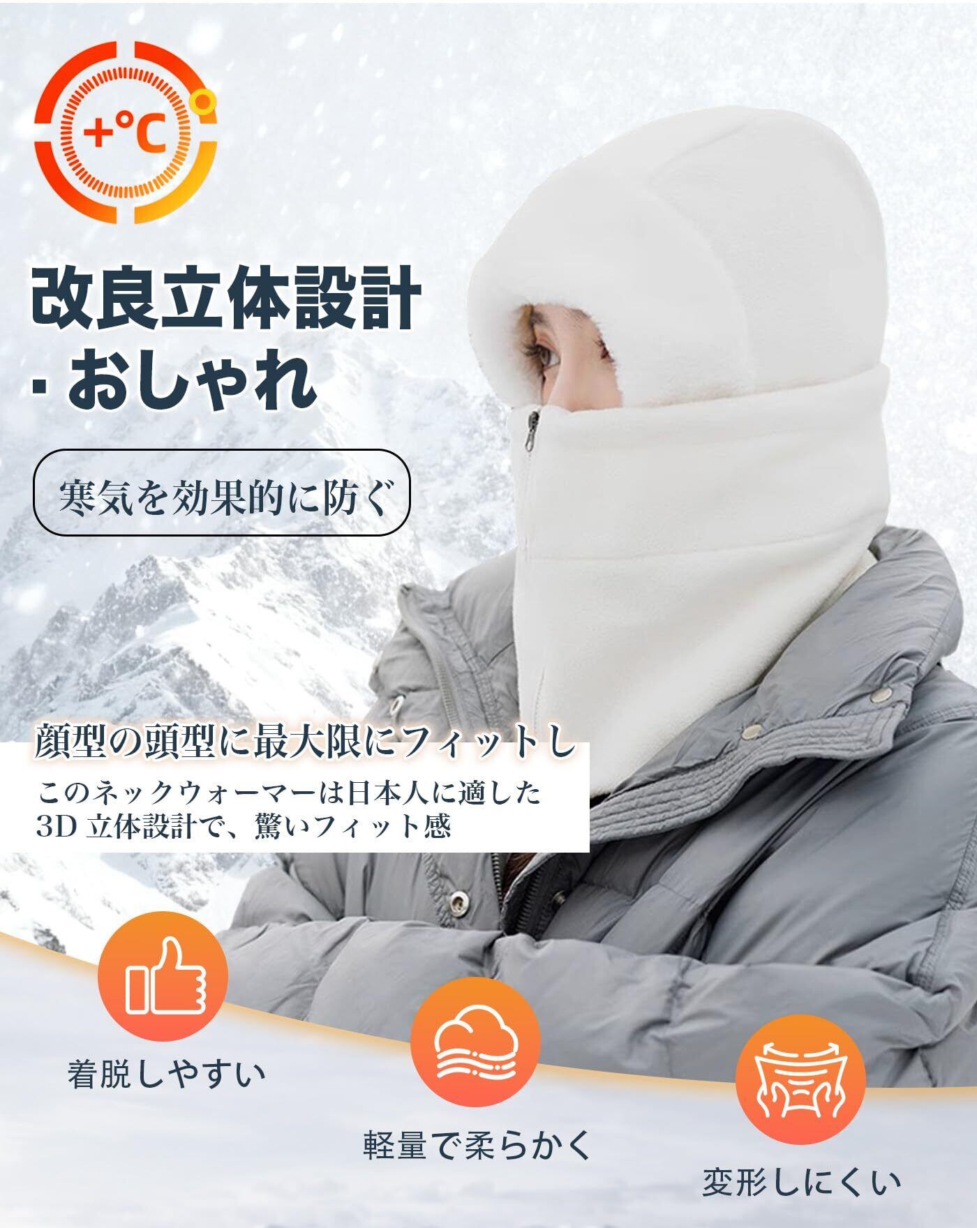 このネックウォーマーは日本人に適した3D立体設計で、驚いフィット感、首のゴム紐による調節可能なシェーピング補助で、顔型の頭型に最大限にフィットし、ネックウォーマーは保温とスタイリッシュさを兼ね備えています。