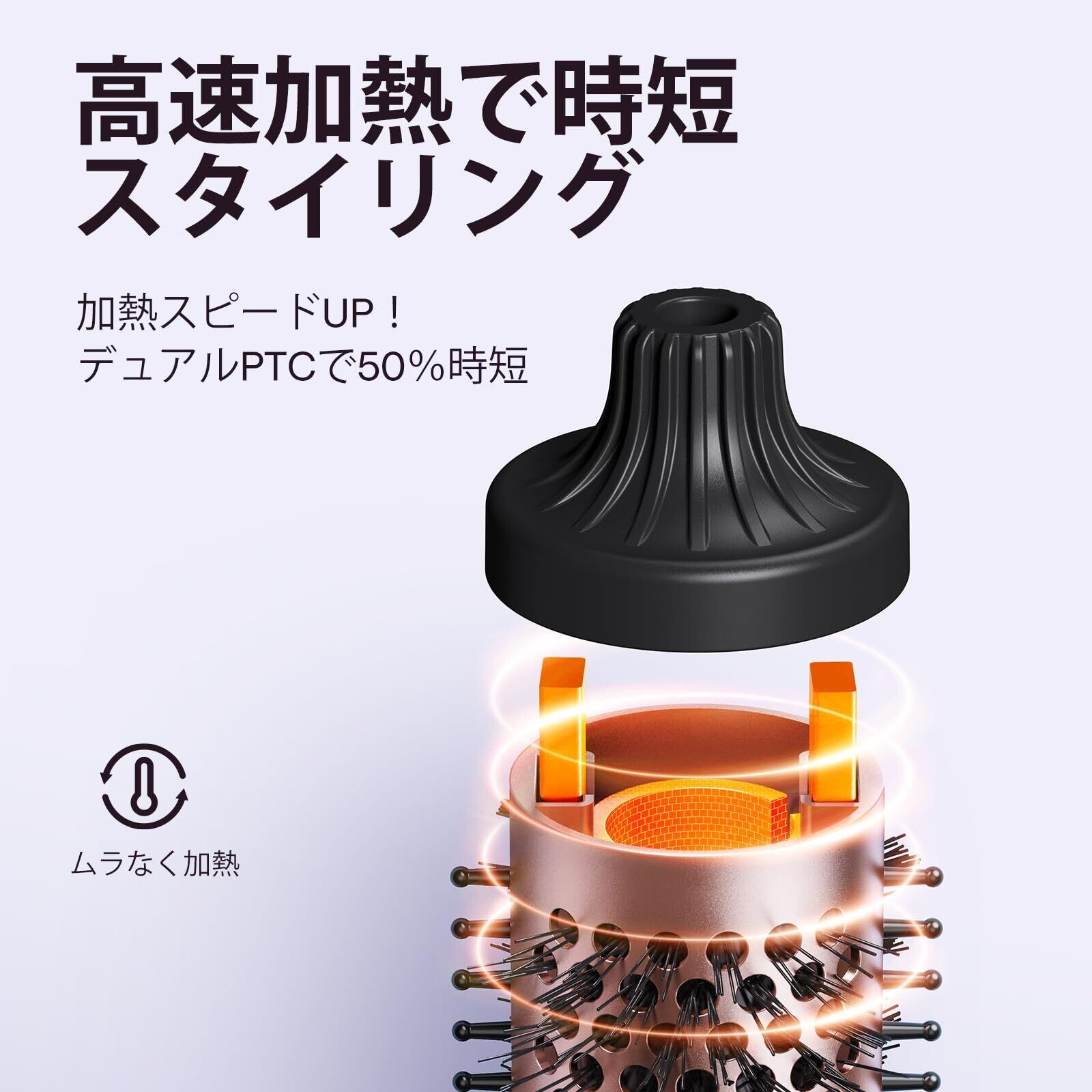 【時短スタイリング】デュアルPTCヒーター搭載で立ち上がりが早く、忙しい朝にもすぐ使える設計。時短スタイリングを可能にし、通常のブローやヘアアイロンでは出せない、ツヤのある美しいカールで柔らかな質感に。最後のボタン操作から、約1時間後に自動的に電源OFFになる安全設計