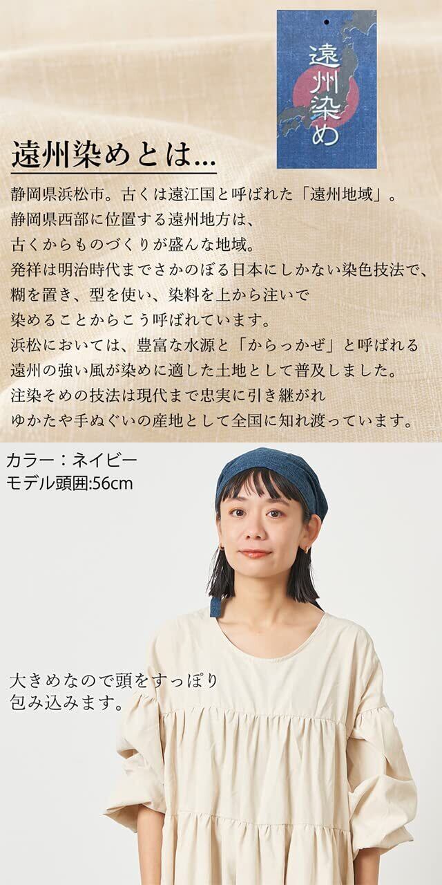 【日本製の三角巾が登場】静岡県西部の遠州地域で普及している「遠州染め」を使したバンダナ。綿100%の日本製のバンダナは程よい厚みがあり、しっかりした素材感で着用感は抜群。また長めの紐は結び目を後ろにしたり、前にしたりアレンジを楽しめるオシャレな三角巾です。