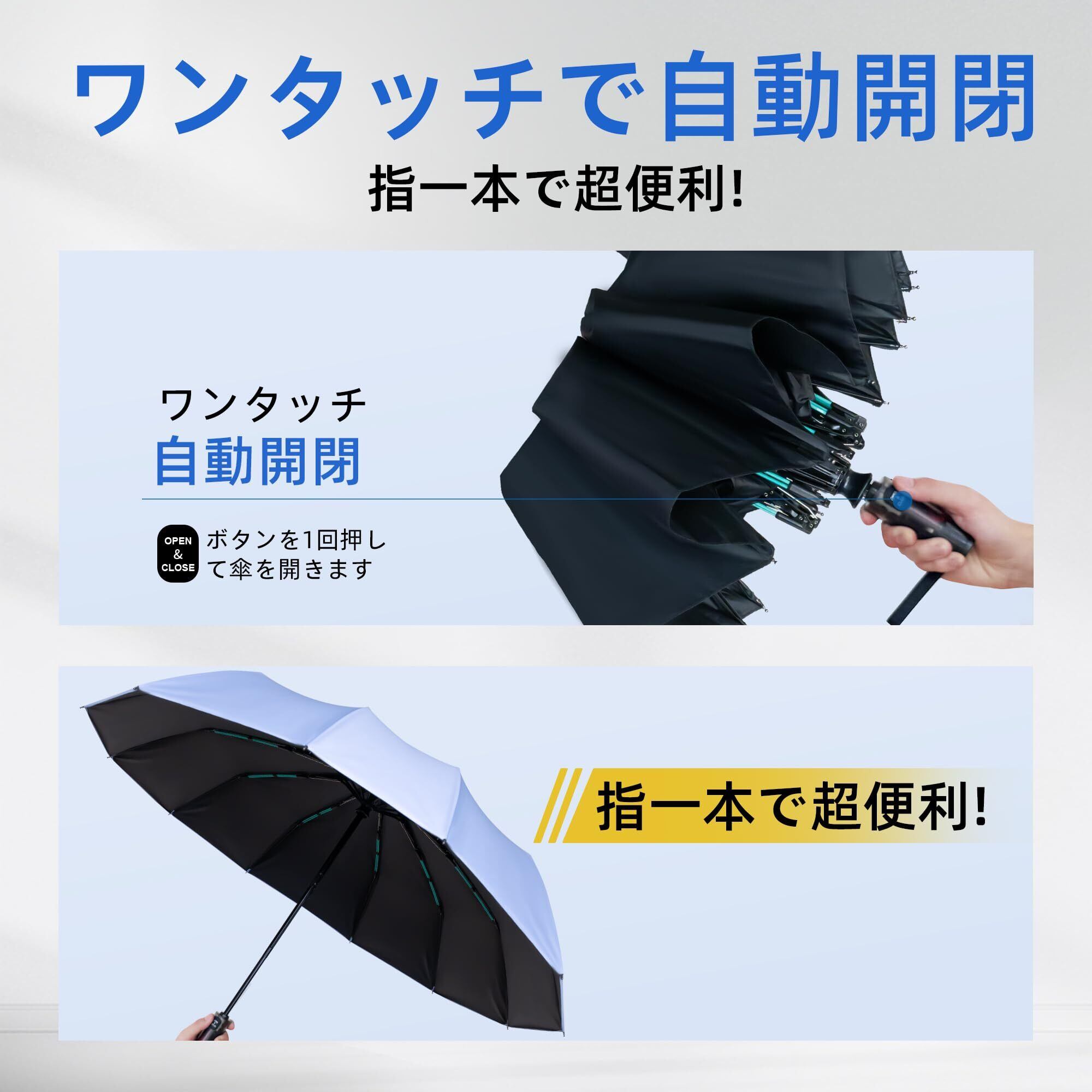 【自動開閉機能】最新の安全ベビーステップ式自動折りたたみ傘は、段階的に収納を行うことで反発を防止し、作業負荷を60%削減します。就学前児童や小学生低学年のお子様でも安全かつ簡単に操作可能です。従来の手動式折りたたみにおける煩わしさ(手動での収納、切り傷、反動によるけがなど)を解消しました。また、ワンタッチで自動開閉可能な設計のため、片手での操作も容易であり、急な雨にもストレスなく対応できます。乗り降り時や片手しか空かない状況においても非常に便利です。一般的な通勤バッグや車内に常備することで、予期せぬ天候変化にも迅速に対応することが可能です。