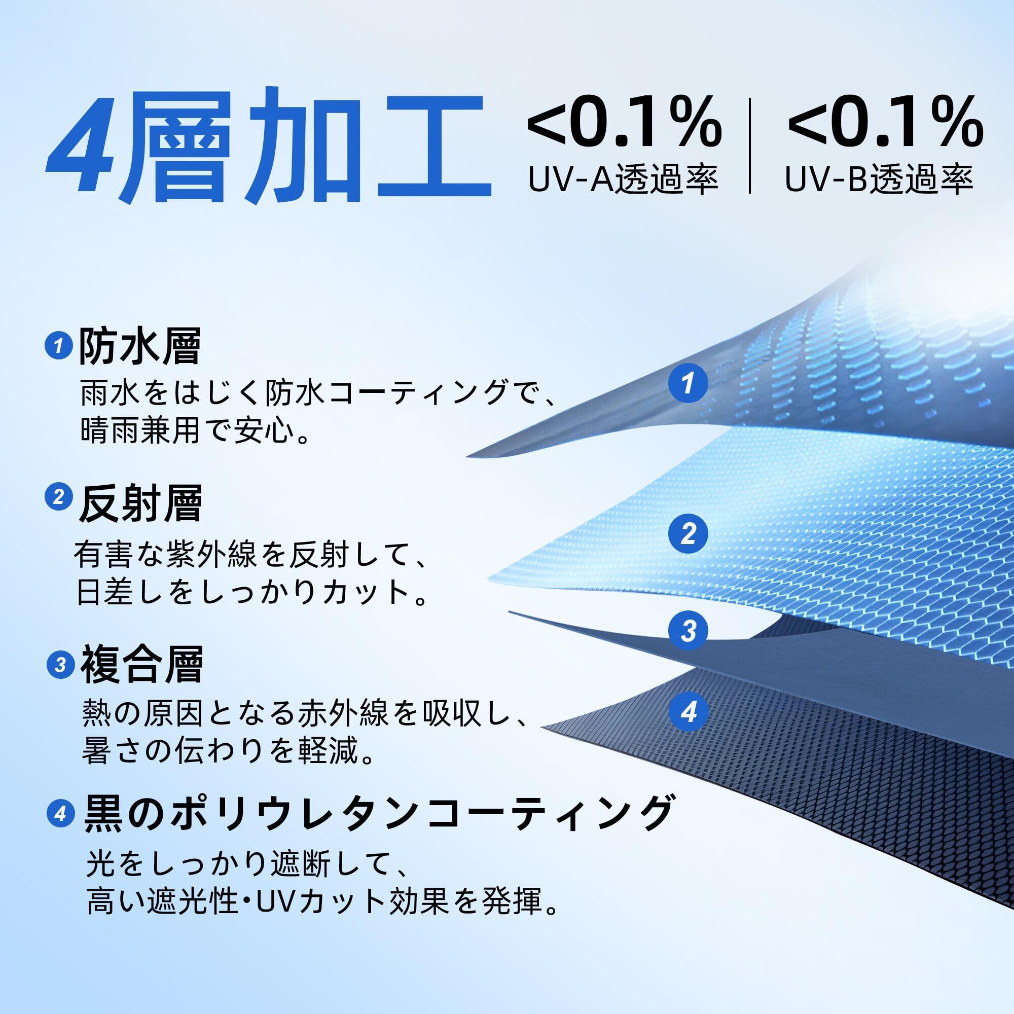 【100%UVカット・100%遮光遮熱】高密度の傘布と日焼け止め機能を持つブラックラバーコートを組み合わせることで、5階の高倍の遮光・断熱性能を実現しています。紫外線カット率は100%(UPF2000+、光透過率0)であり、日差しの中でも涼しさを維持するとともに、肌を効果的に保護します。真夏の強い日射しをしっかり遮り、大切な肌を太陽光線および紫外線から守るUV対策アイテムとして、厳しい暑さにも安心してお使いいただけます。