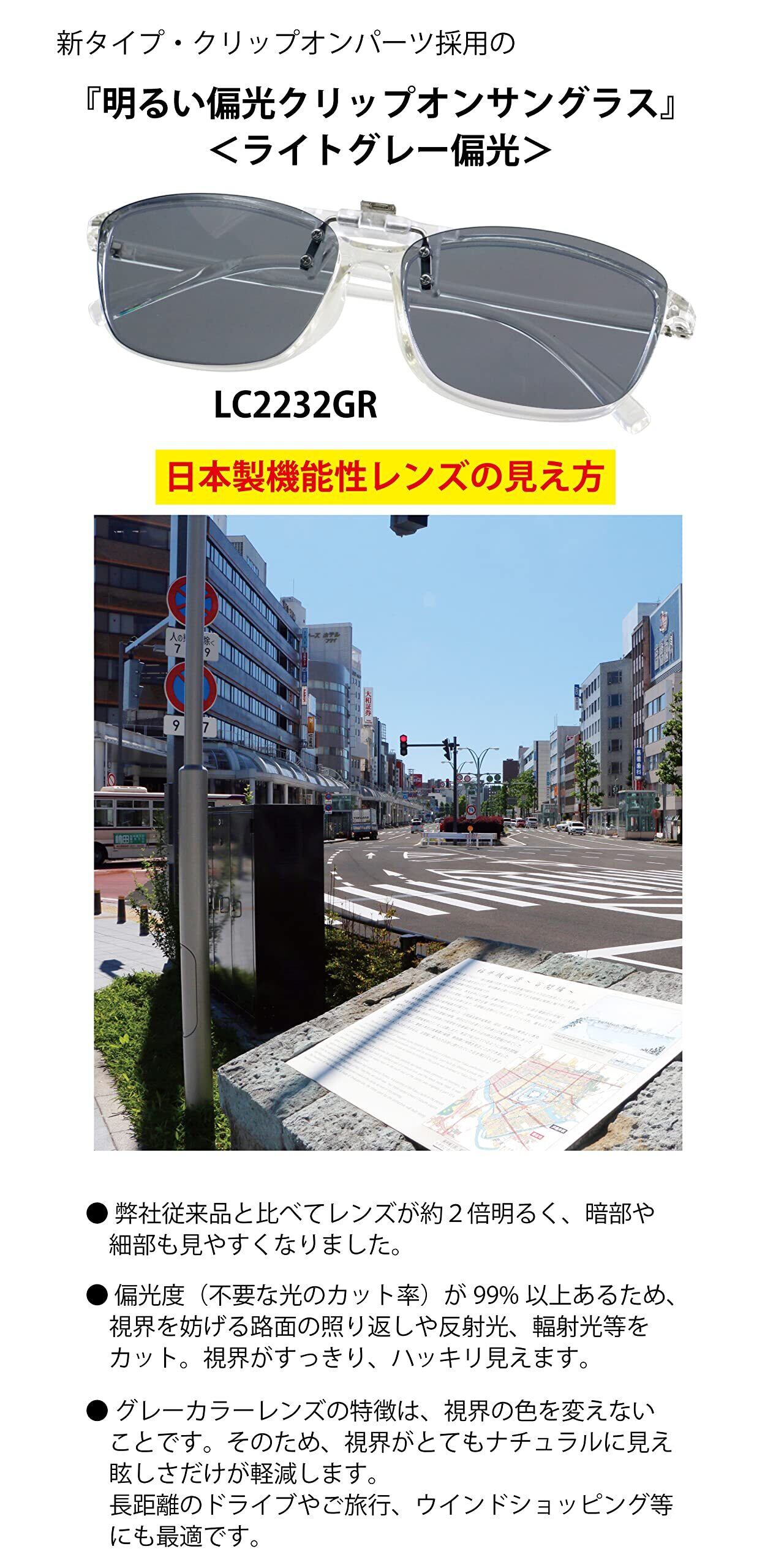 従来よりも小さくて軽い”新型クリップオンパーツ”と日本製の2倍明るい(※ 従来品比)偏光レンズを組み合わせた、今までに無かったオシャレでスタイリッシュな『クリップオン偏光サングラス』です。可視光線透過率が30%以上ととても明るい偏光レンズは日陰や室内でも視界に違和感が無く、スッキリはっきり見えます。明るいレンズですが、紫外線カット率99%以上、ブルーライトもしっかりとカット出来ます。偏光度も99%以上あります。新型のクリップオンパーツは従来品の1/3の大きさで、プラスチック部分も透明色としたため”クリップパーツ”が小さく目立たなくなったため『クリップオン偏光サングラス』がとてもオシャレになりました。 この商品には1年間の品質(書)が付いています。