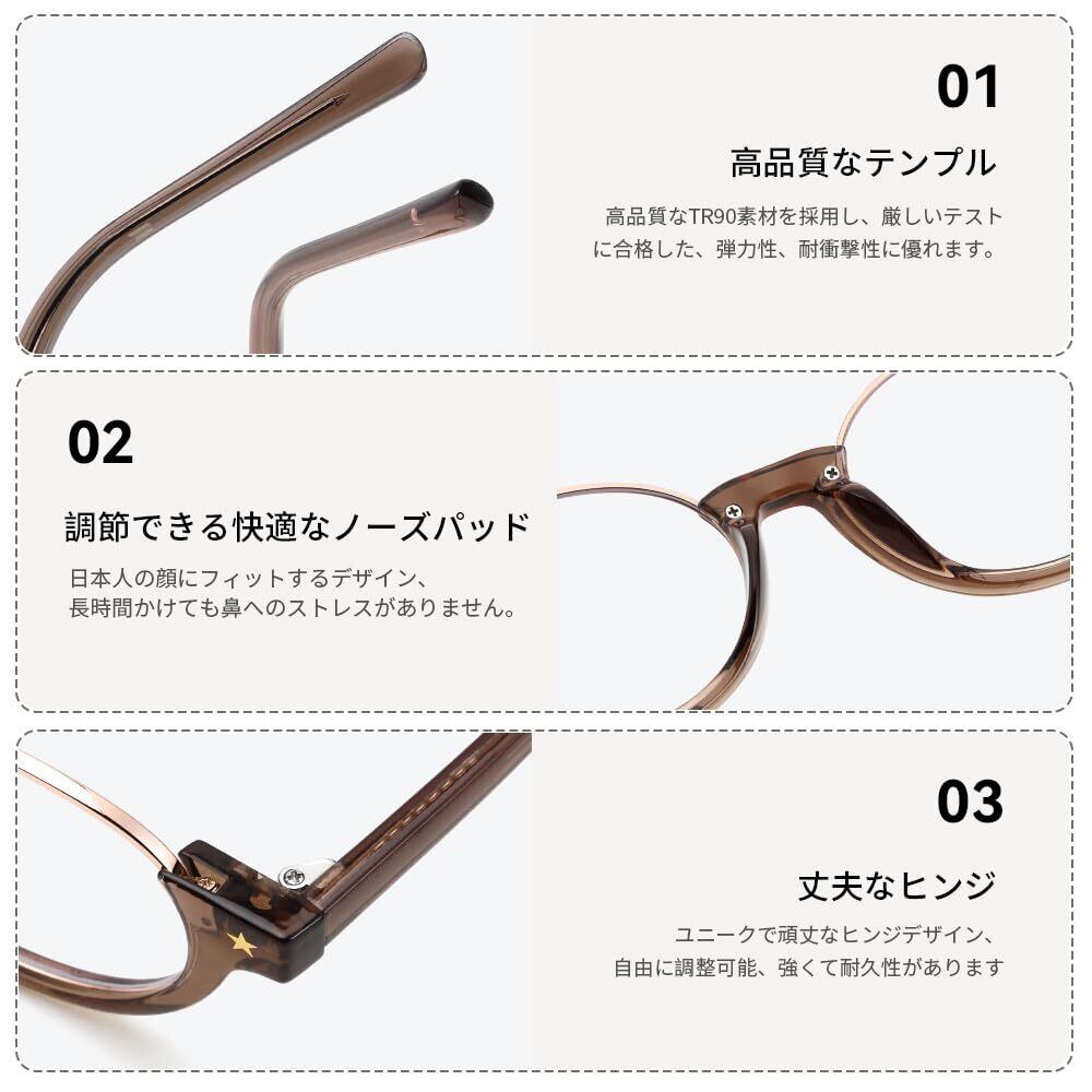 優れた素材:フレームには軽量で柔軟性に優れたTR90を採用。圧迫感が少なく、長時間の着用でも快適です。肌に優しいソフトな一体型ノーズパッドで、フィット感が良く、ズレにくく安定した装着感を実現