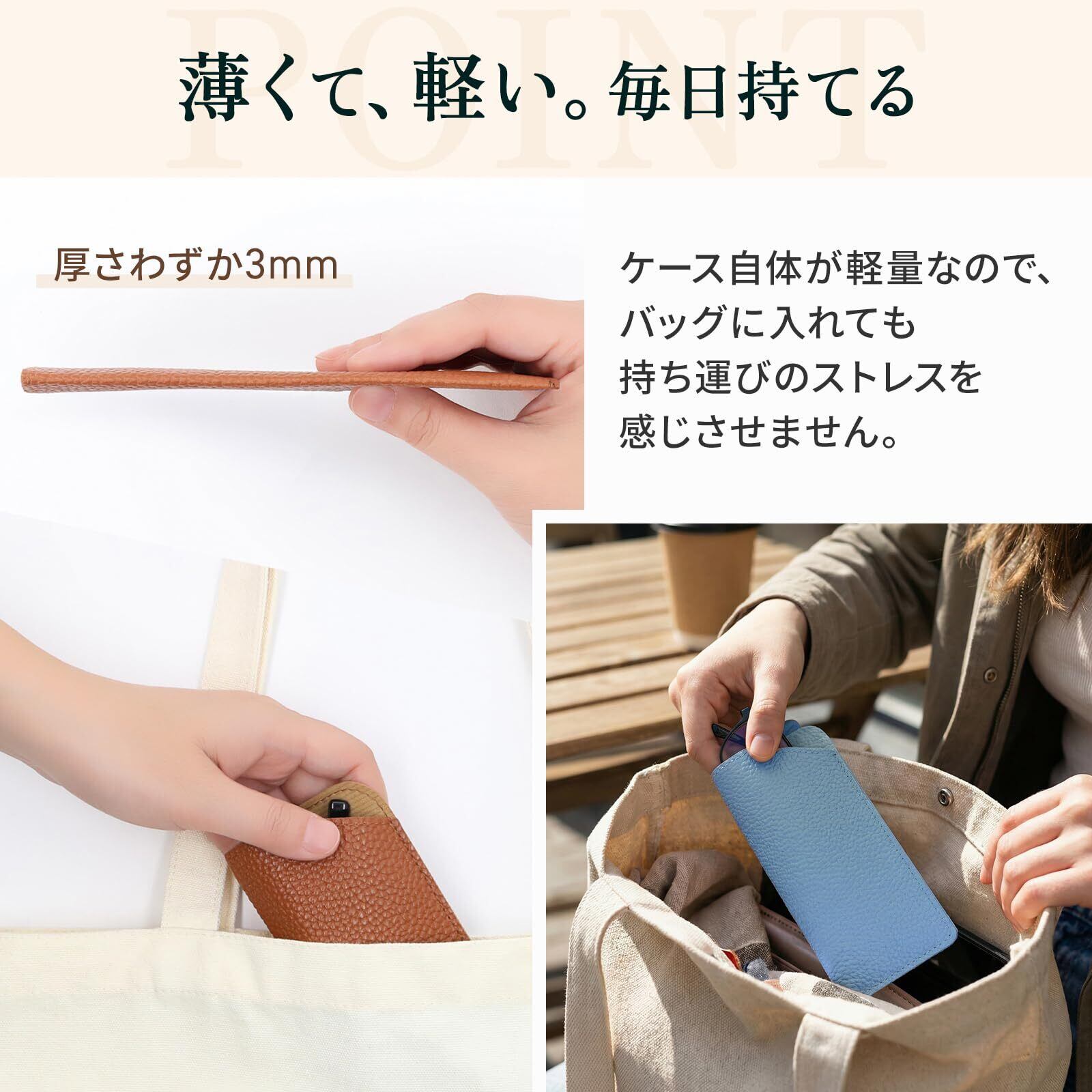 厚さわずか約3mmの薄型デザイン。ケース自体が軽量なので、バッグに入れてもかさばらず、持ち運びの負担を感じさせません。小さめバッグやトートバッグにもすっきり収まります。