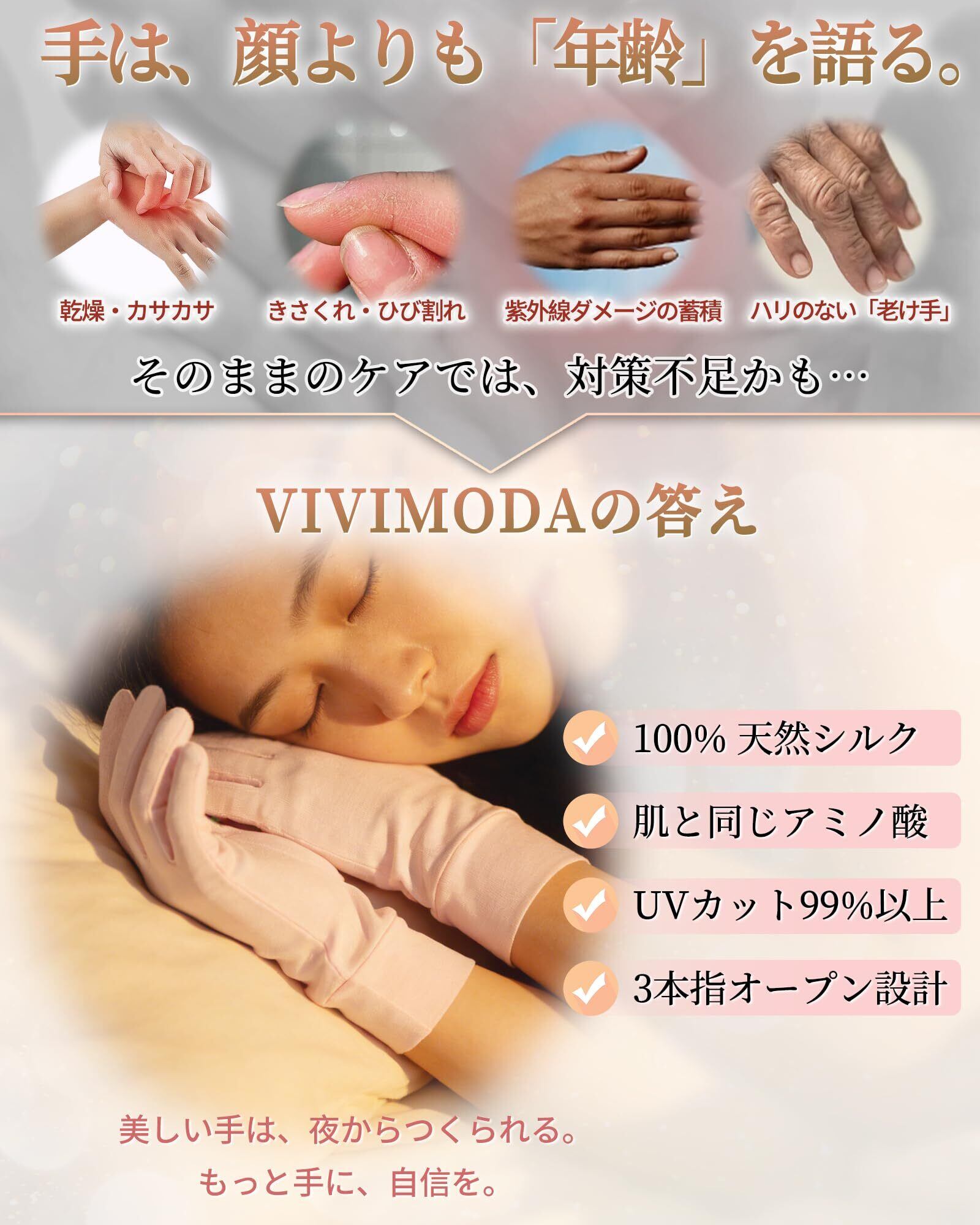 VIVIMODA シルク手袋 便利さとケアを、一枚に込めました。 VIVIMODAが独自に開発した「3本指オープン設計」で、スマートフォンの操作もそのまま快適に。100%天然シルクが、保湿・UVカット・保温という三つの役割を果たし、就寝時から日常の様々なシーンまで、あなたの手肌に寄り添います。 洗えるから清潔に、ワンサイズで選びやすく。上質な毎日を、手元から始めましょう。