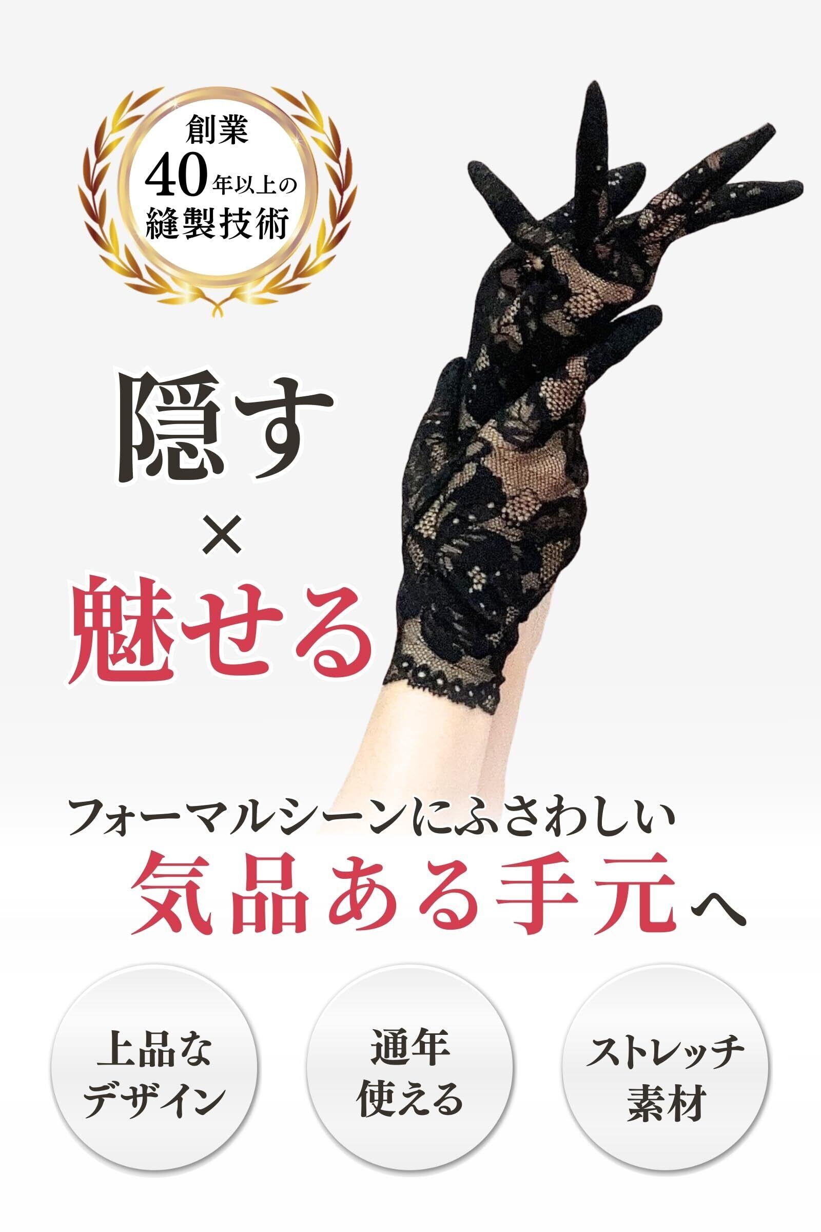 【季節を問わず使えるレースデザイン】通気性の良いレース素材とショート丈で、夏も涼しく快適。手首まで隠れる丈感で、春・夏・秋・冬の通年対応。喪服や礼服に合わせやすく、お通夜・葬式・葬儀など冠婚葬祭で活躍します。