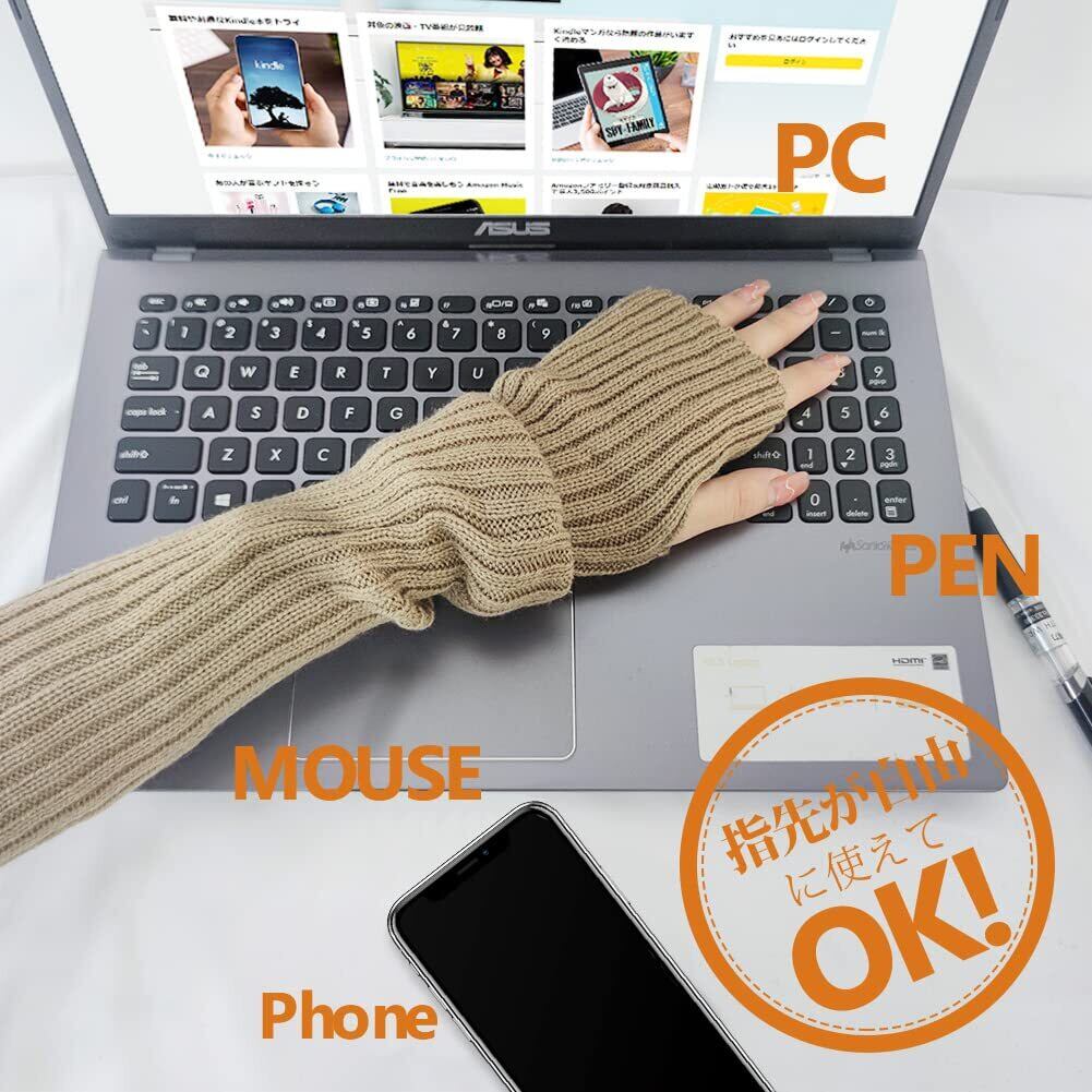 【指掛けタイプでPCやスマホ操作が便利】 指掛けタイプで、ズレにくく、指が簡単かつ柔軟に動くことを可能にします。スマホやPC、マウスの操作もラクです。オフィスワーク時にも最適。自転車に乗るときも冷たい風からしっかり守ってくれます。寒い日から両手をしっかり守って、ちゃんと暖かく保ちるアームウォーマーです。