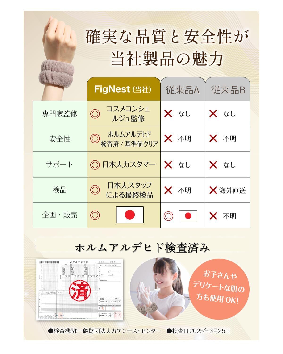 【有害物質ホルムアルデヒド検査済】人体に悪影響を及ぼす物質とされるホルムアルデヒド。このウォッシュバンドは国内の専門機関に依頼してホルムアルデヒド検査を実施。その検査に合格した商品です。デリケートな肌の方や子どもも安心してご使用いただけます。(検査機関:一般財団法人カケンテストセンター/検査日:2025年3月25日)
