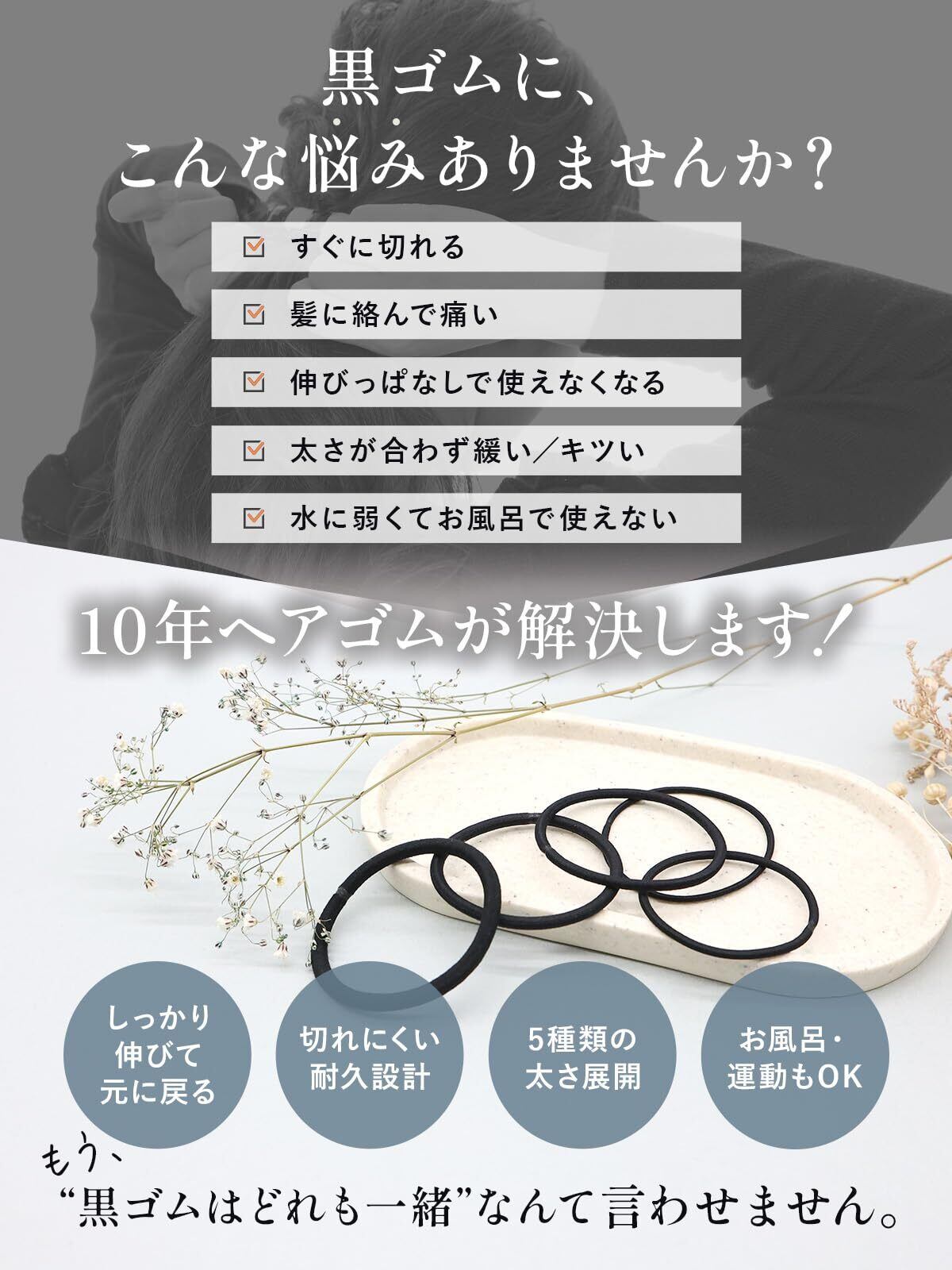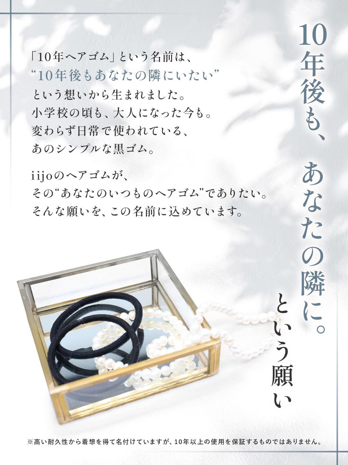 【10年後もそばにいたいという想いを込めて】「10年ヘアゴム」は、“当たり前に使える良いもの”を目指したブランドの象徴。小学生の頃から大人になっても、ずっと使いたくなる黒ゴムです。
