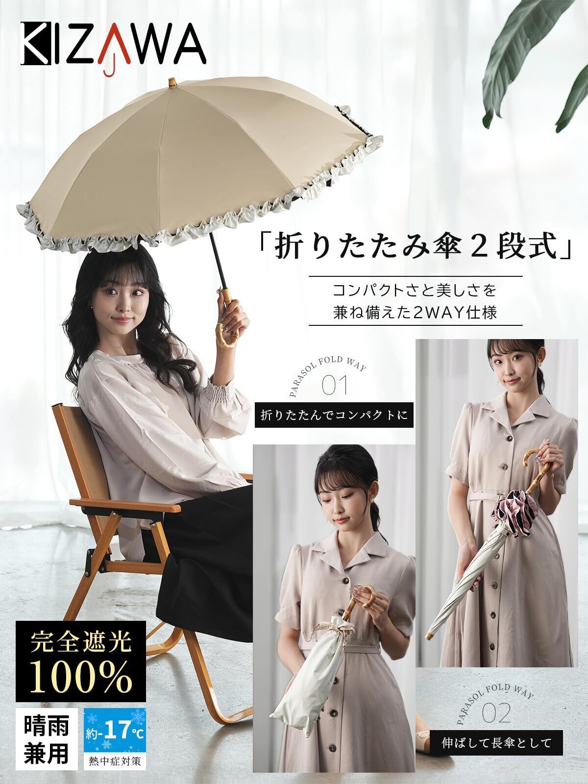 KIZAWA 日傘 折りたたみ 二段式 uvカット 100 遮光 長傘 逆折り 2段折り 完全遮光 レディース 5級撥水 折り畳み 軽量 遮熱 晴雨兼用 かわいい 母の日のプレゼント バンブー 持ち手