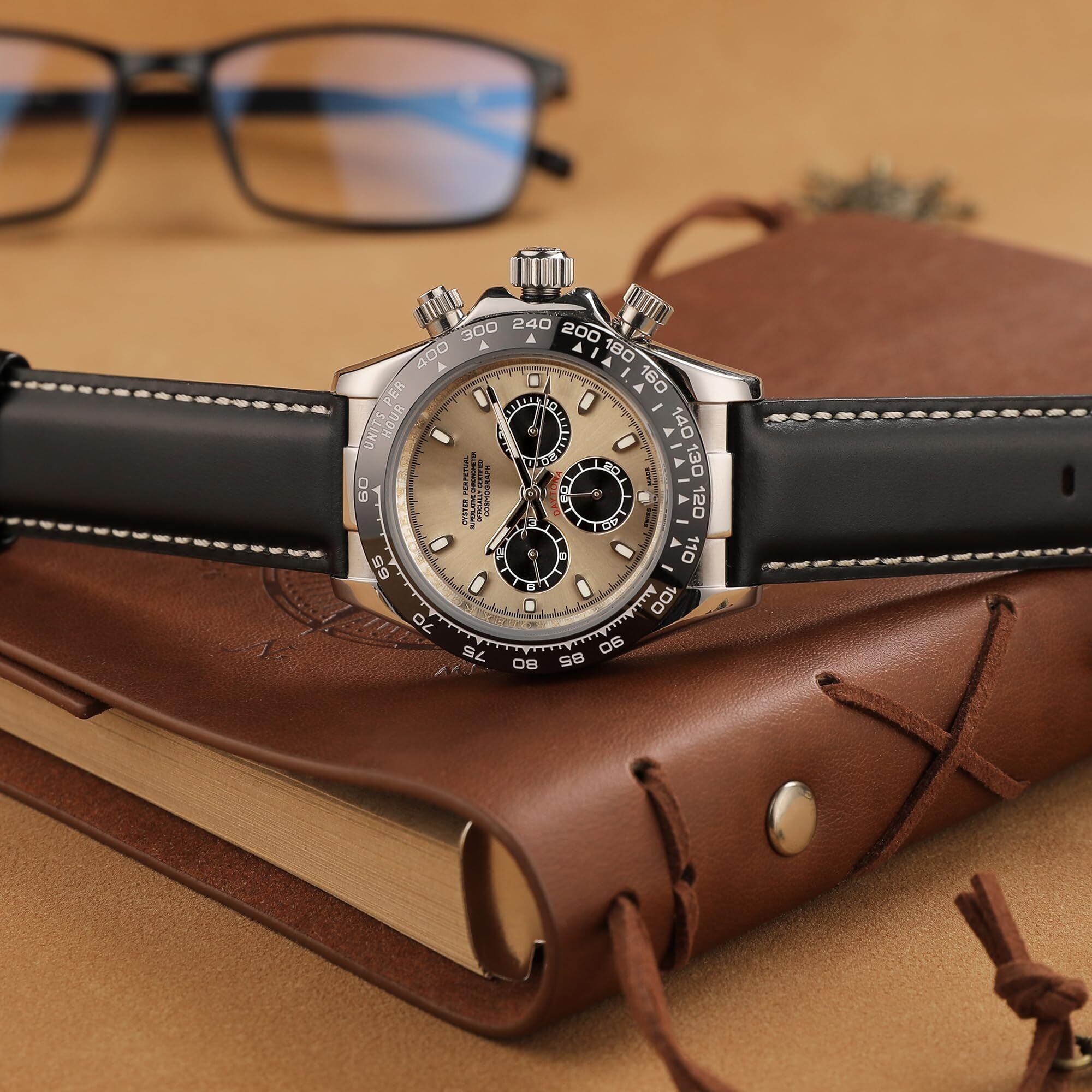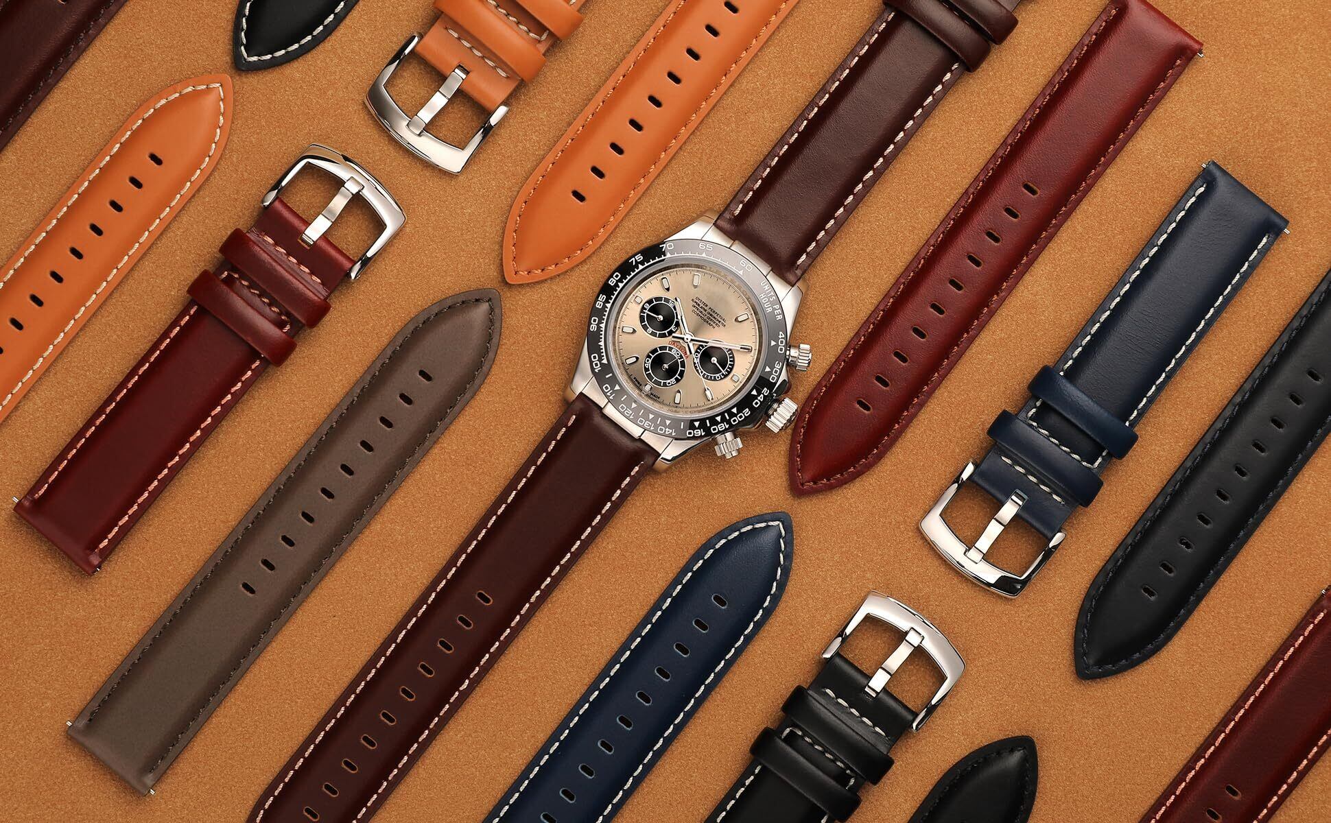 トップグレイン本革とヌバック: 厳選されたトップグレイン本革が CORROPELLE の高品質腕時計バンドの最上層に使用されており、軽いワックスのような感触で高級感を演出しています。時間の経過とともに自然な緑青が生まれ、この腕時計バンドは使い古されたような、時代を超越した感触になります。これらの単純な欠陥は、どんな時計にも豊かな質感を加えます。処理された裏面のベージュのヌバック裏地は肌触りが非常に柔らかく、滑りを最小限に抑えながら理想的な快適さと汗による悪臭を防ぎます。