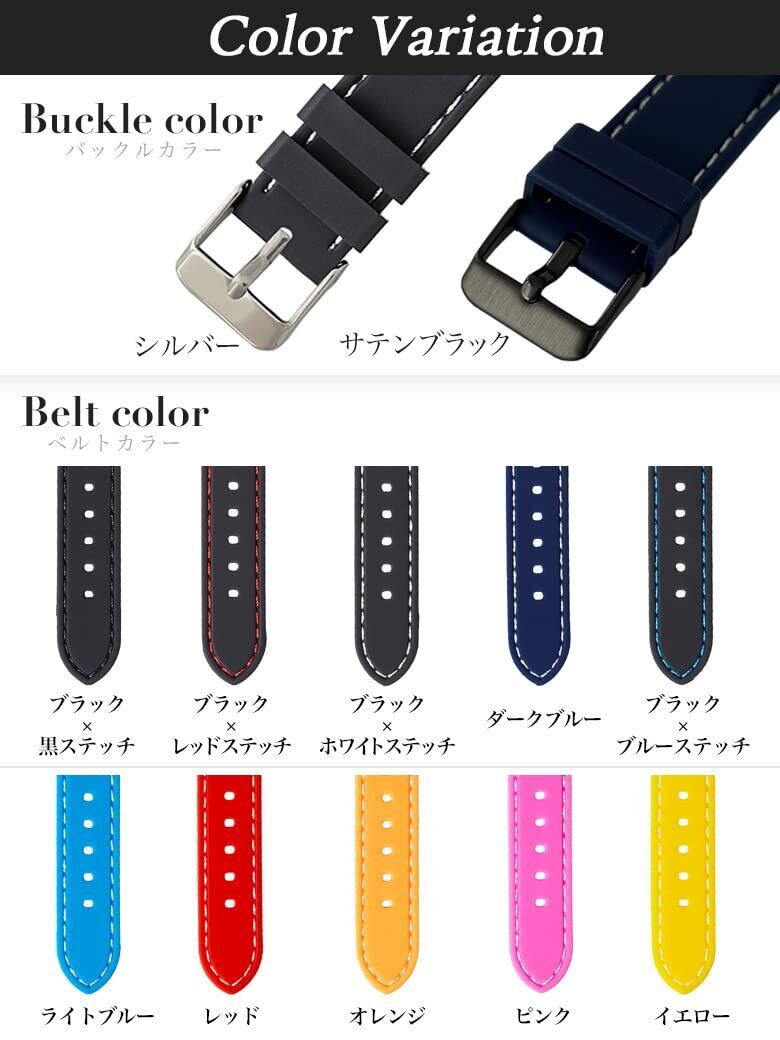 【素材】シリコンラバー(ベルト)、ステンレス(尾錠) 【カラー】ブラック、ダークブルー、ブラック×ホワイトステッチ、ブラック×レッドステッチ、ブラック×ブルーステッチ、イエロー、ライトブルー、ピンク、レッド