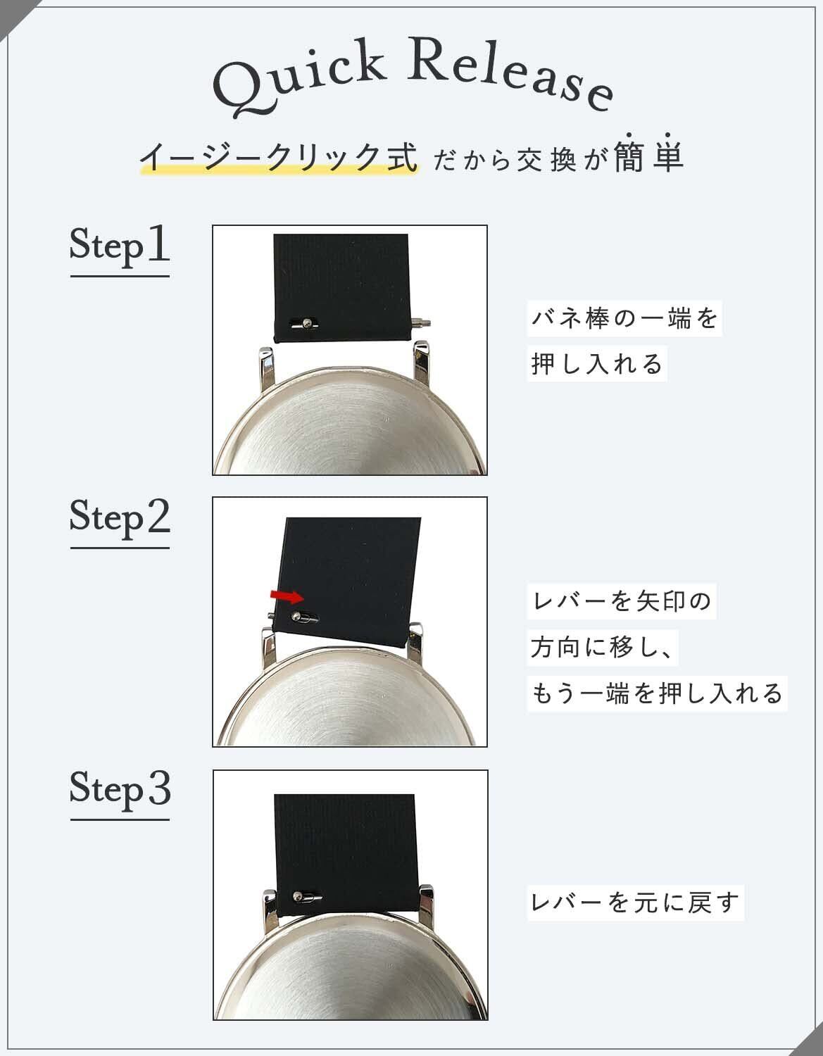 【 商品詳細 】クイックリリースで取り付け簡単。シンプルなデザインに、カラーステッチがお洒落なアクセントに。デイリーからアウトドアまで大活躍。使い慣れた時計が生まれ変わります。