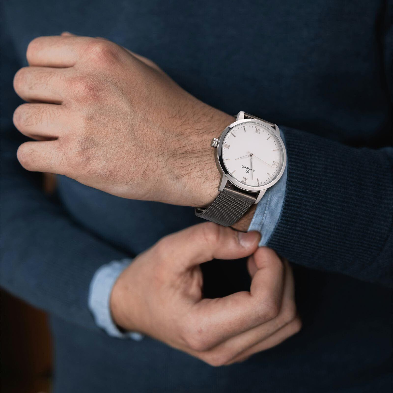 ソリッドな質感でビジネスシーンにぴったりのメタルブレス。きちっとした印象で、スーツにも私服にも合わせやすいのが特徴です。