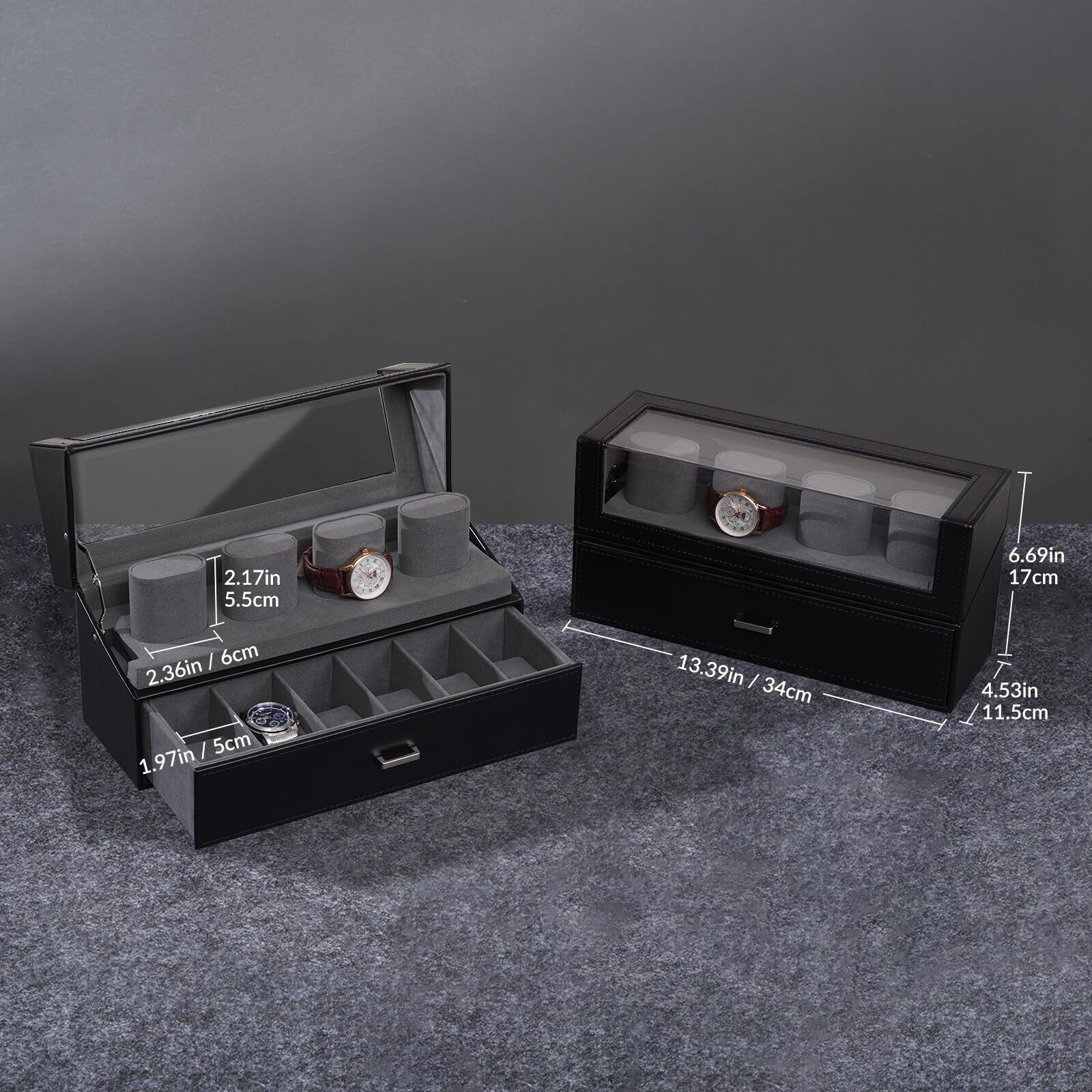半分がアクリルのカバーになっているので、時計コレクションを美しくディスプレイでき、お気に入りの時計を一目で見つけられるので、収納時間の節約にもなります。