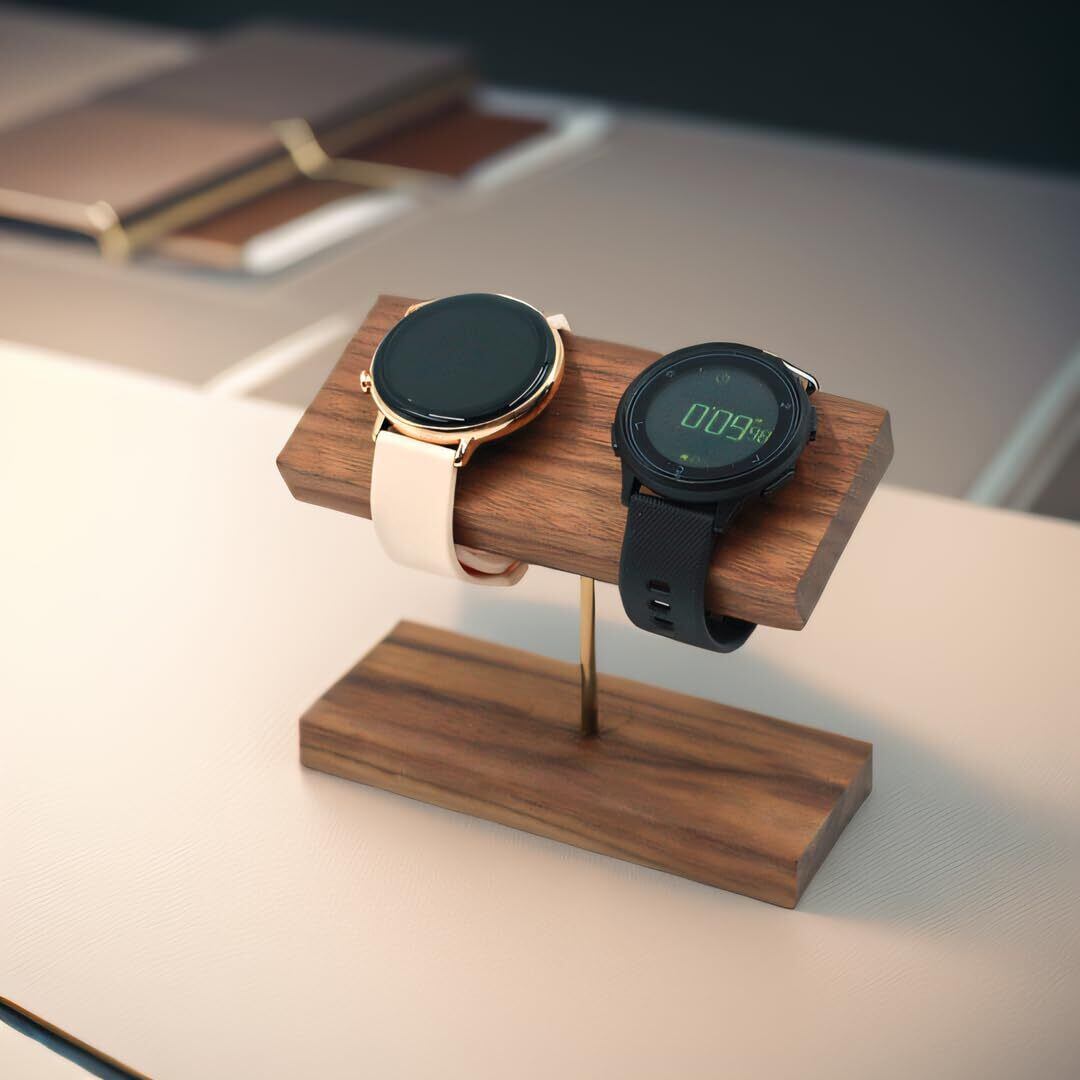 堅牢且持久:金属のフレームが安定地サポート、黒胡桃は温かさと質感を与え、共に長期耐用の手時計用台座を創造する。