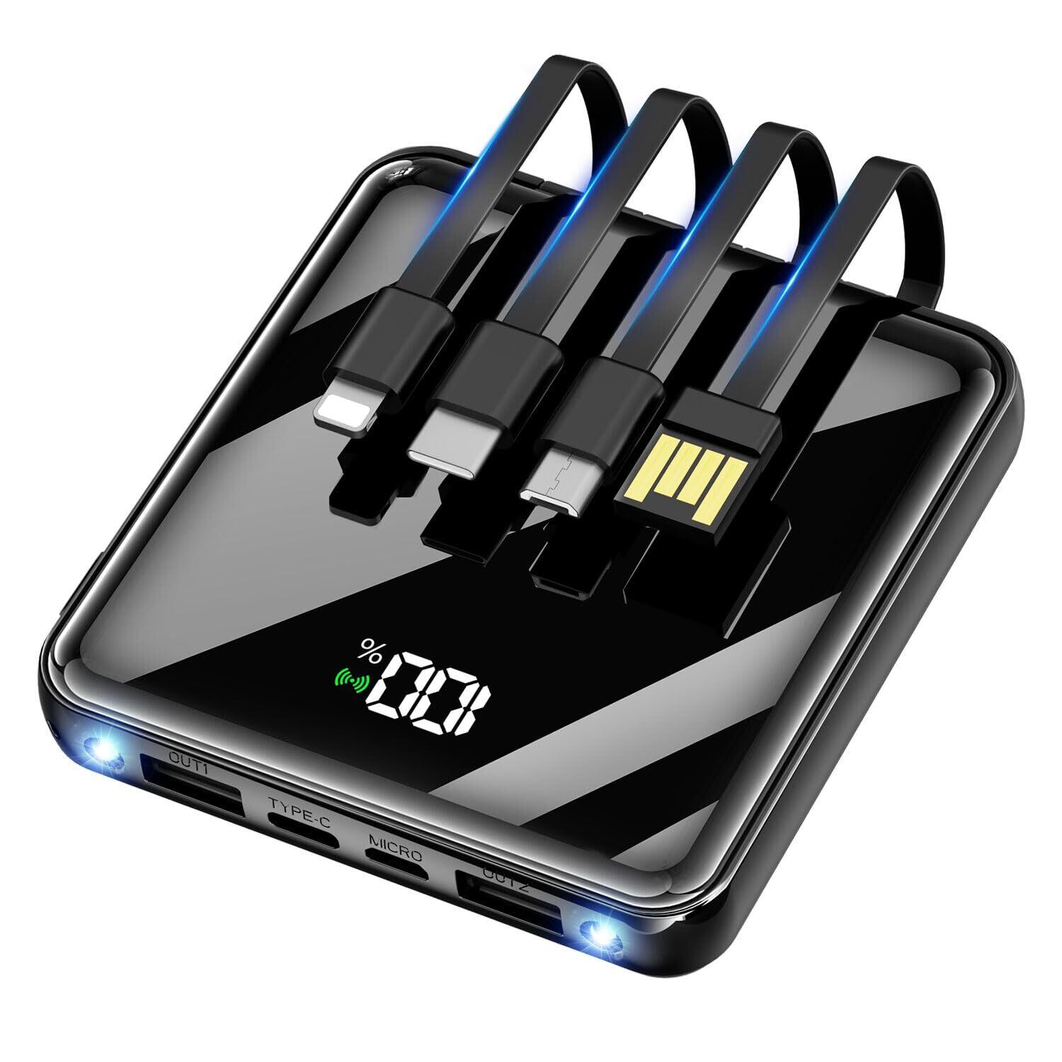 【4種内蔵ケーブル×4ポート、6台同時給電×3WAY蓄電】最新型のケーブル一体型モバイルバッテリーです。Lightning、Type-C、Micro USBの出力ケーブルとUSB入力ケーブルを内蔵しており、別途ケーブルを持ち歩く必要がなく、蓄電も給電もこれ一台で完結できます。さらにMicro USB入力ポート、Type-C入力ポート、USB出力ポート×2を備え、入力・出力ともに多様な接続が可能です。2つのUSBポートと3規格の内蔵ケーブルに加えてQiワイヤレス充電にも対応しており、合計6種類の給電方式を自由に選べます。最大6台まで同時に給電できるため、複数デバイスを一度に利用する方に最適です。入力も3WAY対応で、内蔵USBケーブル、Micro USBポート、Type-Cポートのいずれからでも蓄電でき、利便性に優れています。