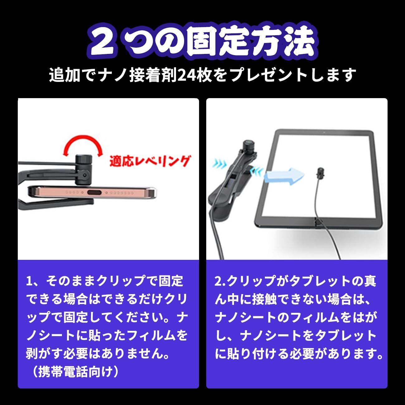 【2つの固定方法】1、そのままクリップで固定できる場合はできるだけクリップで固定してください。ナノシートに貼ったフィルムを剥がす必要はありません。(携帯電話向け) 2.クリップがタブレットの真ん中に接触できない場合は、ナノシートのフィルムをはがし、ナノシートをタブレットに貼り付ける必要があります。