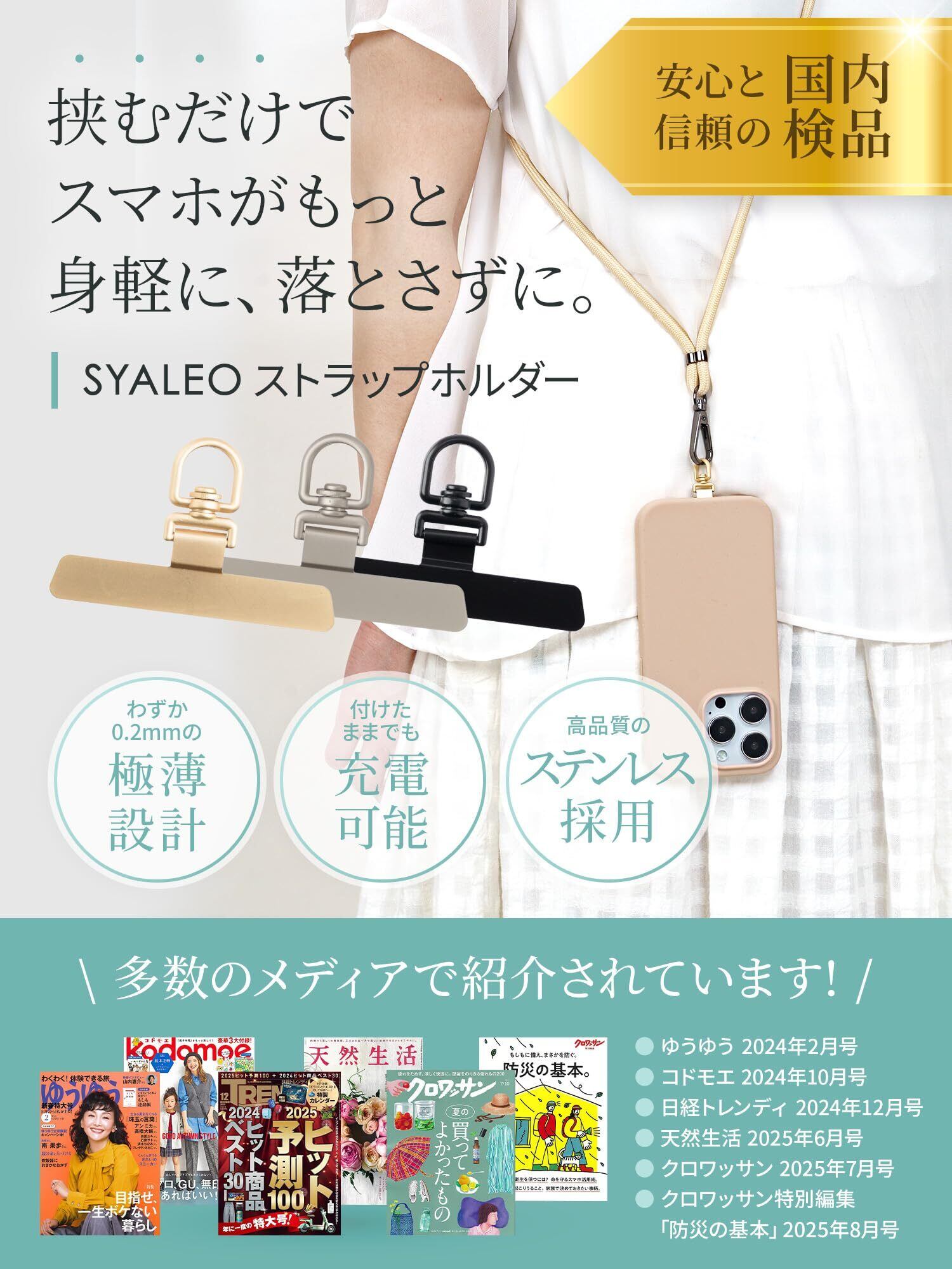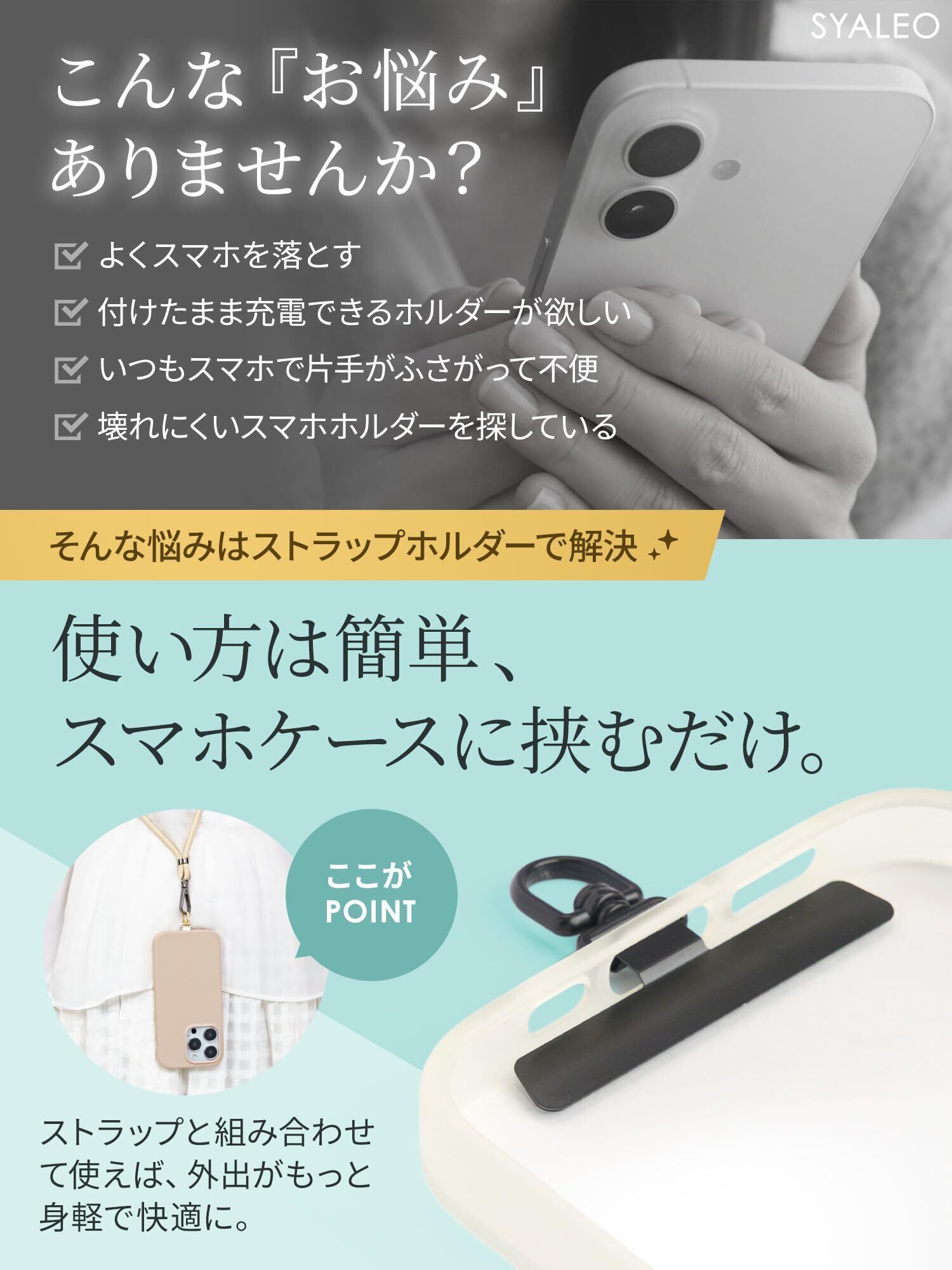 【スマホケースに挟むだけで使えるストラップホルダー】多数のメディアで紹介されている、挟むだけで使えるストラップホルダーです。ストラップと組み合わせて使えば、外出がもっと身軽で快適になります。