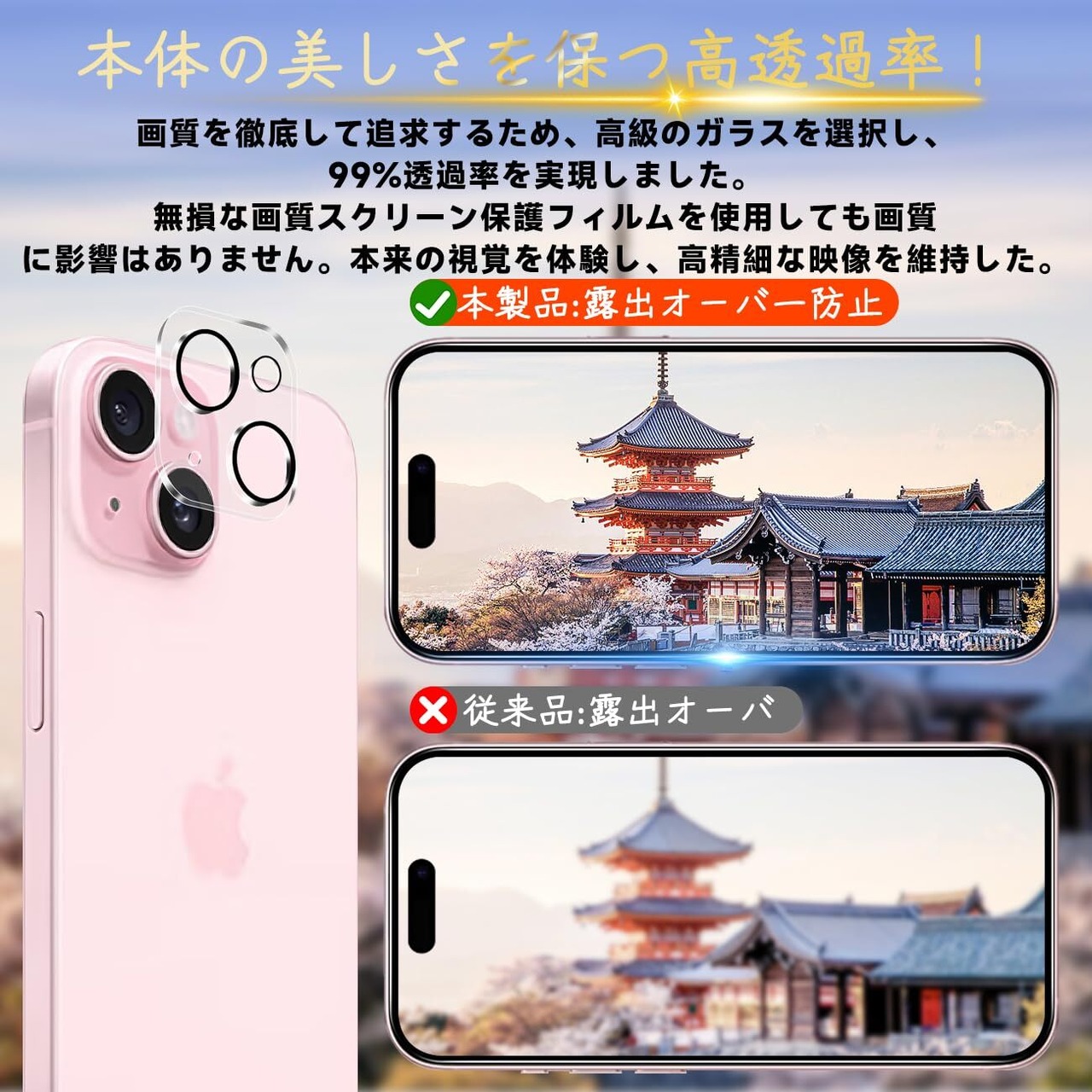 【超高透過率】新しいアップグレードした光学プロジェクション技術を使って、液晶画面保護ガラス フィルムを改良した後、約99.9%高い光線透過率に達し、より高い光透過率と超クリアな視覚体験を実現します。しかも液晶画面の本来の美しさにも影響しません。高精細度でいつでも写真やビデオをきれいに撮影することが可能です。