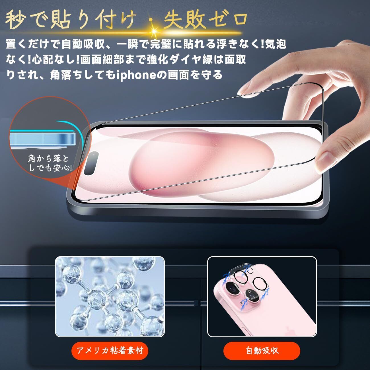 【専用設計·簡単に貼り付け】 本製品 Apple iPhone15 アイフォン15 いpほね15 専用液晶画面保護ガラスフィルムです。本商品は厳選した素材を採用して作られており、フィルムのシリコン自己吸着層があるので、スチールフィルムを携帯電話に合わせて軽く置くだけで、気泡が入らないように簡単に取り付けられます。(ポイント:フロントカメラのカメラ穴についてですが、ほこり・異物などの堆積を防止するため、ガラスフィルムにカメラ穴を開けていません。Seninhiのガラスフィルム 、透過率は99.9%なので、フロントカメラの正常使用に全く影響がありません。)*機種によってサイズが異なりますので、ご購入の場合に機種をよく確認してください。