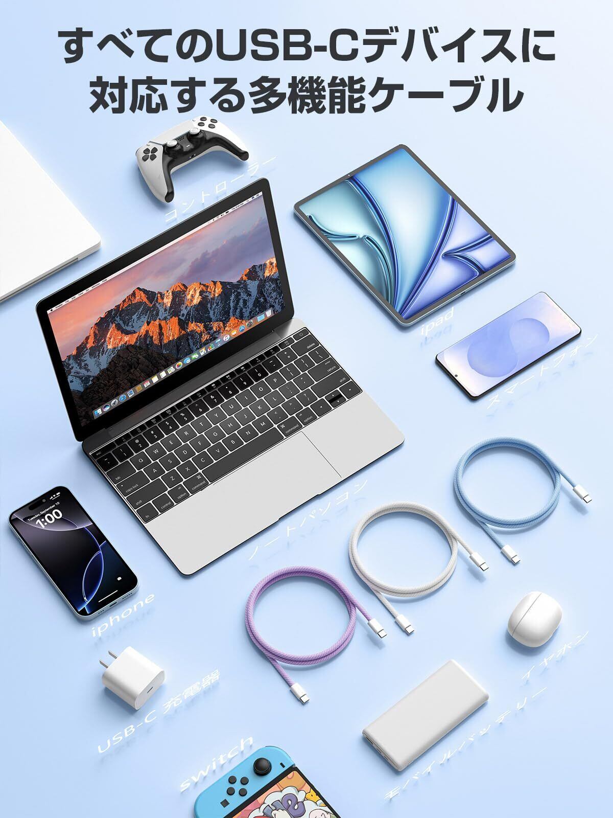 幅広いType-C機器に対応 : iPhone 15 / 16 / 16e / 17、iPad、MacBook、Nintendo Switch、Galaxy、Sony、HUAWEI、Samsung Galaxy、Pixelなど、各種Type-C対応デバイスで充電・データ転送が可能です。※本製品は充電・データ転送専用で、映像出力には対応しておりません。