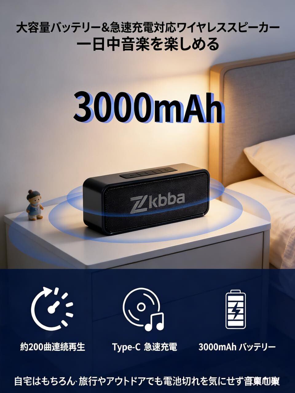 【Type-C充電&長持ちバッテリー】BluetoothスピーカーはType-C充電ポートを搭載し、デバイスを簡単に充電できます。3000mAhの大容量バッテリーと先進的な省電力技術により、フル充電状態で最大24時間の連続再生を実現。バッテリー切れの心配なく、朝から夜まで一日中音楽を楽しめます。