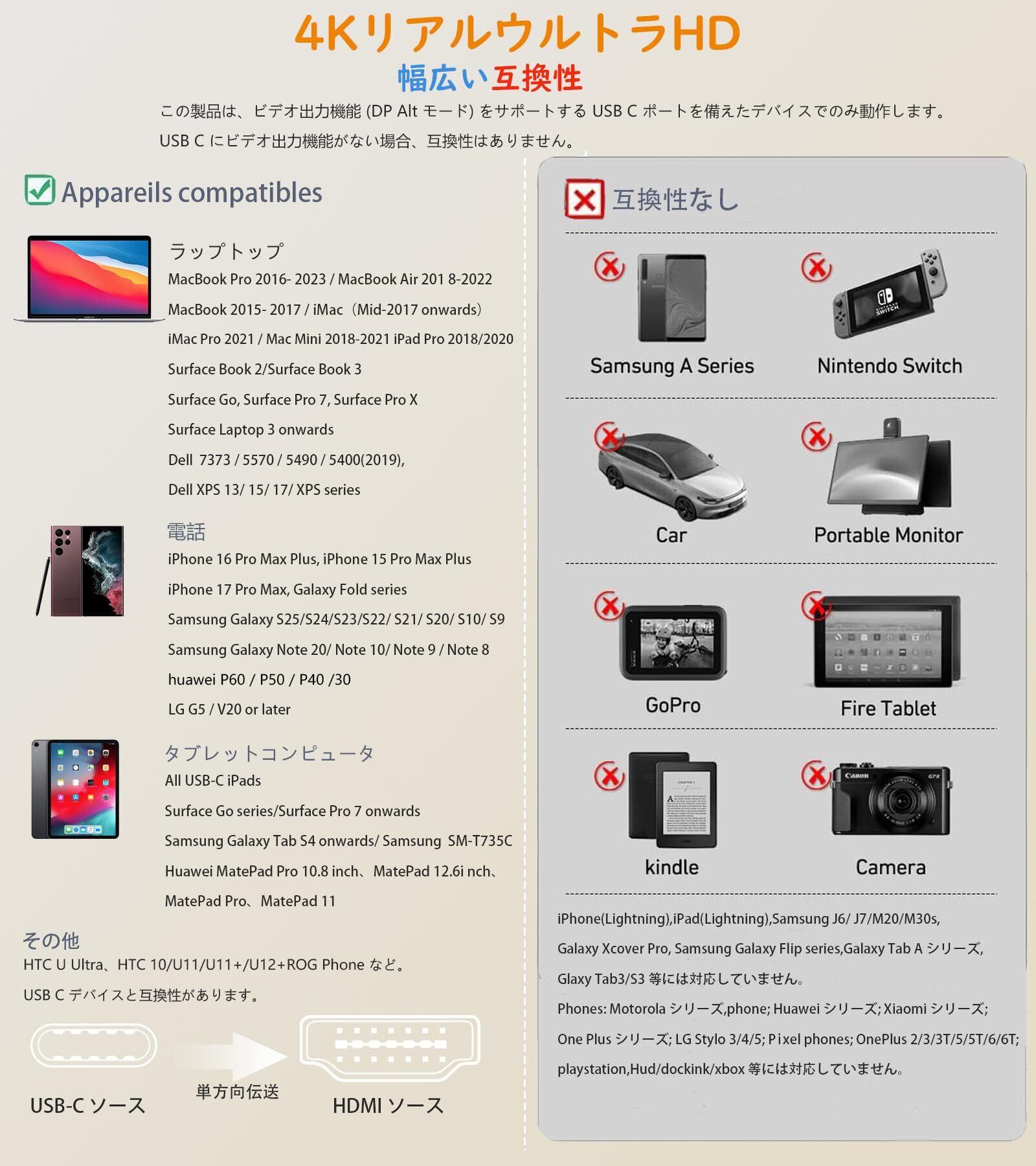 【幅広い機種対応】iPhone 17 16 15 Pro Max,2020/2019/2018/2017/2016 MacBook Pro、2020/2018 MacBook Air、2020/2018 iPad Pro、2021/2020/2019/2017 iMac、iMac Pro、2020/2018 Mac mini、2015/2016/2017 MacBook、Samsung Galaxy (S26 S25 S24 S23 S22 S21+/S21/S20+/S20/S10+/S10/S9+/S9),等のUSB-Cポートを備えた設備間を接続できます。USB-C - HDMI ケーブルは、Type-C 対応のすべての携帯電話やタブレットと互換性があるわけではないため、購入する前に互換性を確認してください。Sony Xperia、Sharp Aquosについて、ほとんど非対応機種となりますので、ぜひお先にお問 い合 わせください。※(iPhone 16e / iPhone Air には対応していません)。