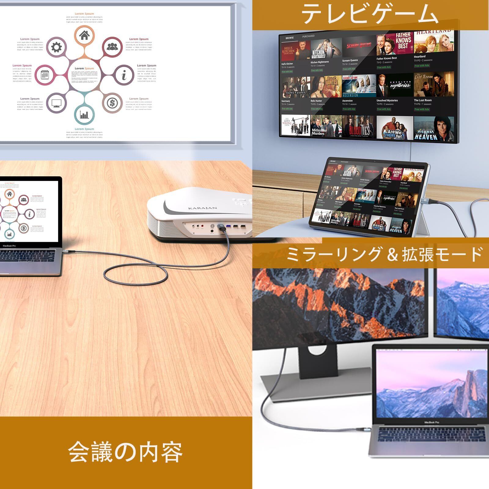 【適用場合】USB-C HDMIケーブルは家作業だけでなく、会議室や展覧会、研究室、発表会などの商務場合も活躍です。映画、ビデオ、ゲームなどのコンテンツを大スクリーンで簡単に楽しめます。パソコン、テレビ、モニター、プロジェクターに直接に接続したら、映像出力できるType C to HDMI変換ケーブルです。お使いの機器のUSB-CポートとディスプレイのHDMIポートに両端子を接続するだけで簡単にご使用いただくことができます。