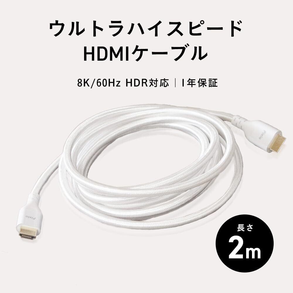 【2022最新】Pixio ウルトラハイスピード HDMIケーブル 2m 白 PXH212BW HDMI2.1B 8K/60Hz 4K/120Hz HDR対応 ナイロンメッシュ ホワイト シルバー