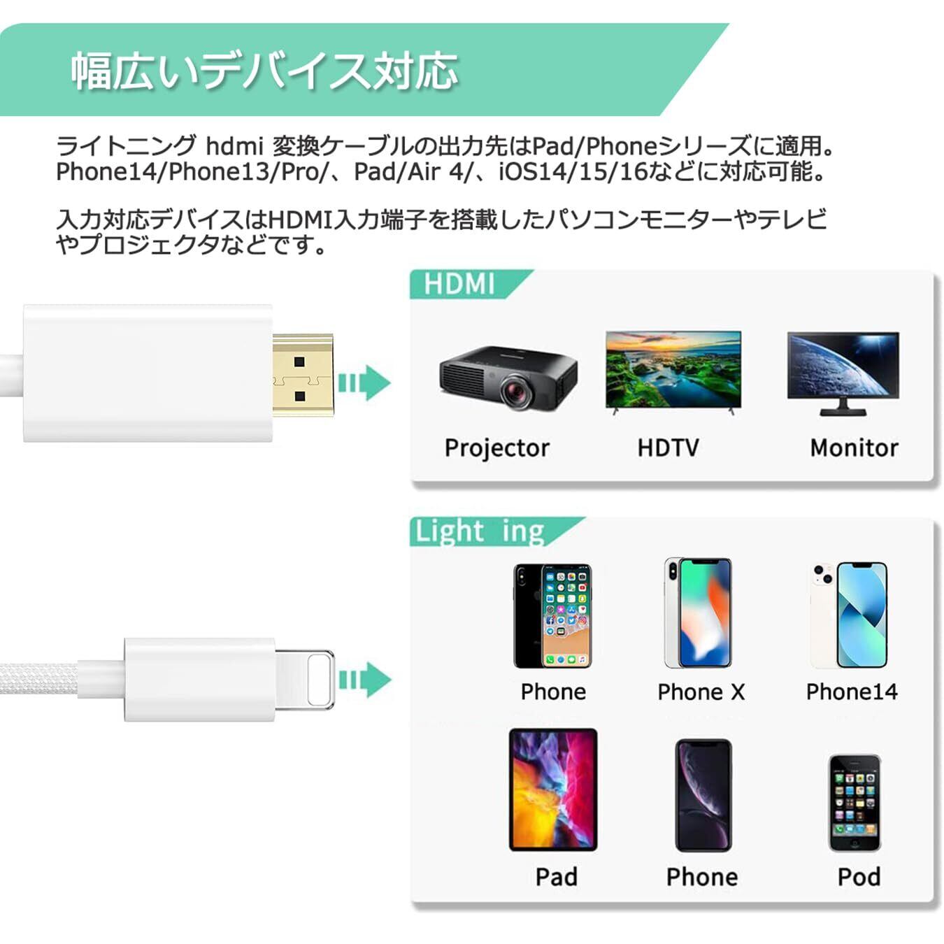 【幅広い対応機種】hdmi 変換ケーブルの出力先はPad/Phoneシリーズに適用です。このPhoneからHDMIケーブルは、Phone14/14 Plus/14 Pro/14 Pro Max、Phone13/13 Plus/13 Pro/13 Pro Max、Phone12/12 Mini/12 Pro/12 Pro Max、Phone 11/11 Pro/11 Pro Max、Phone SE 2020、Phone X(10)/XR/XS/XS Max、 Phone 8/8 Plus、Phone 7/7 Plus、Phone 6S/6S Plus/6/6 Plus、Phone 5/5S/5C/SE、Pad Pro、Pad Air、Pad Mini 1/Mini 2/Mini 3/Mini 4、Pod Nano 7、Pod Touch 5th/6th Gen を含むその他のデバイスに対応しています。入力の対応デバイスはHDMI入力端子を搭載したパソコンモニターやテレビやプロジェクタなどです。