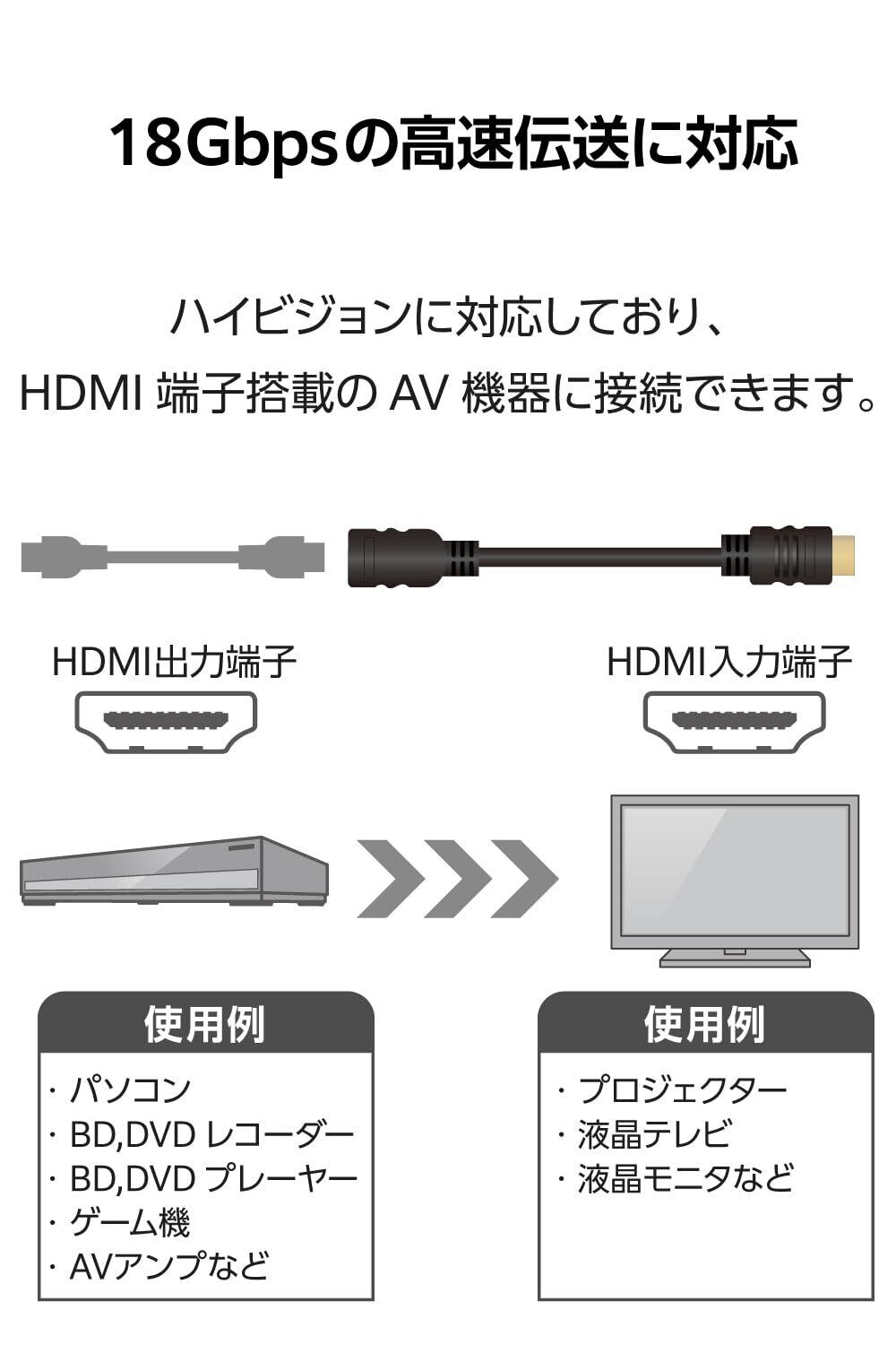 ■対応機種:HDMIプラグ(タイプA・19ピン)側:HDMI入力端子を持つ液晶テレビ、プラズマテレビ、プロジェクター等、HDMIポート(タイプA・19ピン)側:HDMIケーブル、HDMI出力端子を持つストリーミングデバイス等 ■規格:Premium High Speed HDMI Cable with Ethernet (HDMI 2.0)準拠 ■コネクタ形状1:HDMIプラグ(タイプA・19ピン) ■コネクタ形状2:HDMIポート(タイプA・19ピン) ■ケーブルタイプ:スタンダード ■伝送速度:18Gbps ■対応解像度:最大4K(3840×2160px)/60Hz ■シールド方法:3重シールド ■プラグメッキ仕様:金メッキピン・金メッキコネクター ■ケーブル長:約50cm ※コネクター含まず ■ケーブル径:約6.0mm ■カラー:ブラック ■パッケージ形態:袋+ステッカー ■環境配慮事項: EU RoHS指令準拠(10物質)、簡易パッケージ