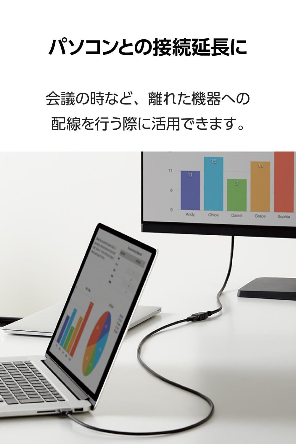 最大4K/60Hzの解像度に対応したHDMI延長ケーブルです。Premium High Speed HDMI Cable with Ethernet準拠で、映像信号と音声信号に加え、100Mbpsのイーサネット通信を実現します。